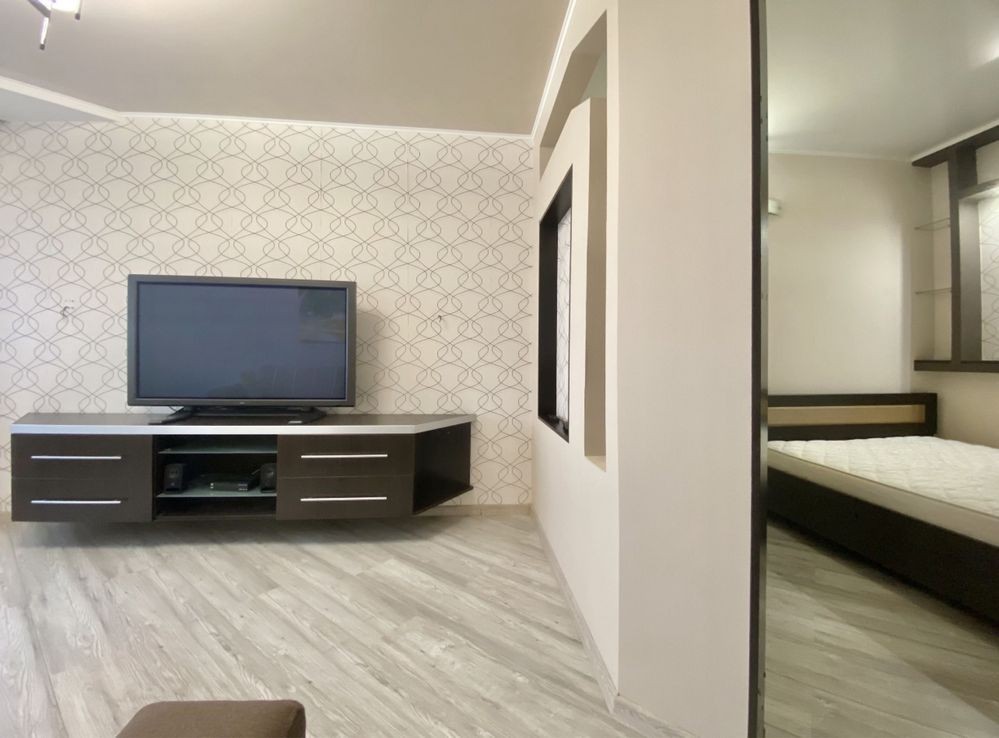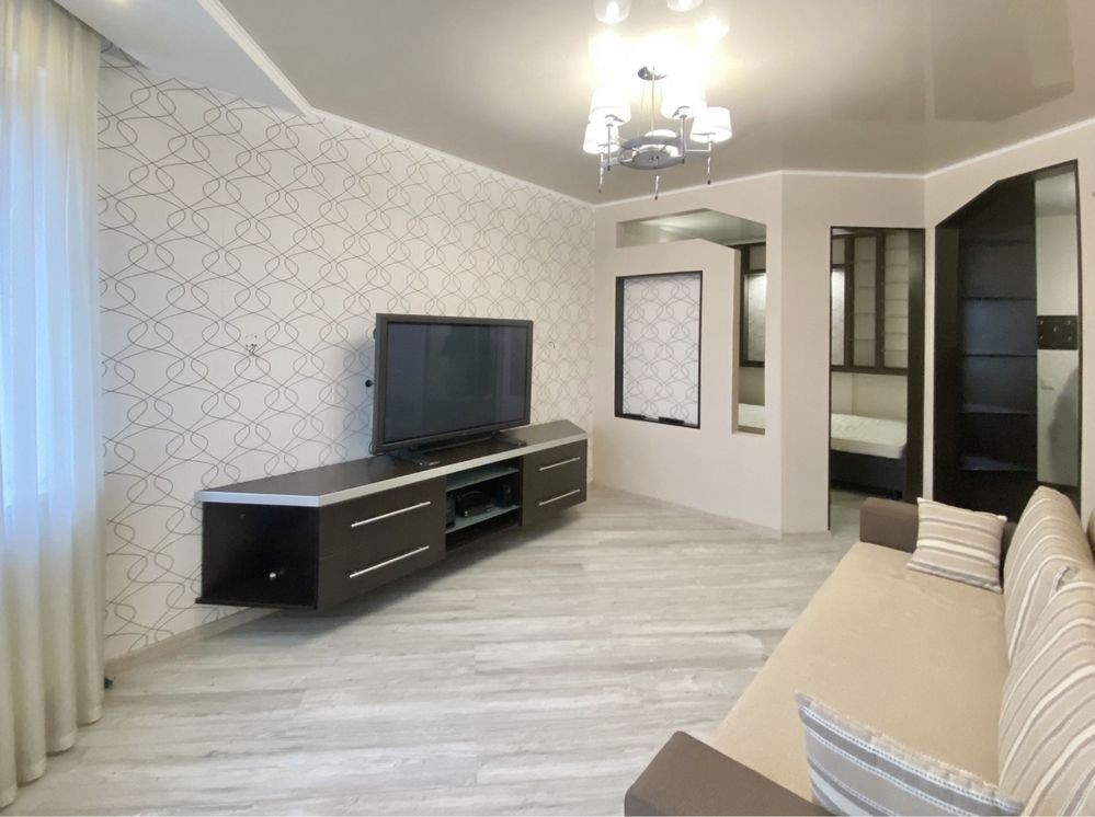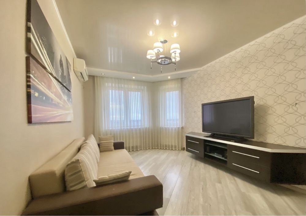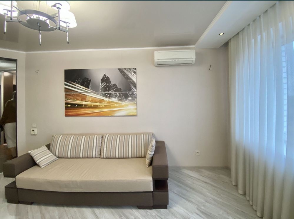 Ця простора і затишна, квартира має все необхідне для комфортного життя, кімната поділена на 2 зони спальню з двомісним ліжком і вітальню з розкладаним диваном, де зроблений кондиціонер і закладені всі виводи і кріплення під «домашній кінотеатр», на стіні поряд з вимикачами встановлений дистанційний пульт управління газовим котлом і кліматом у квартирі.