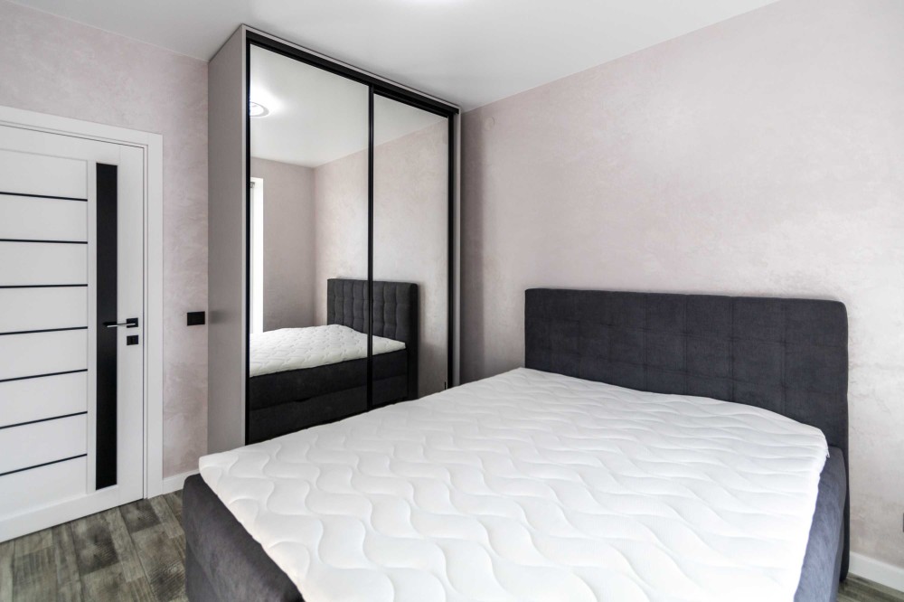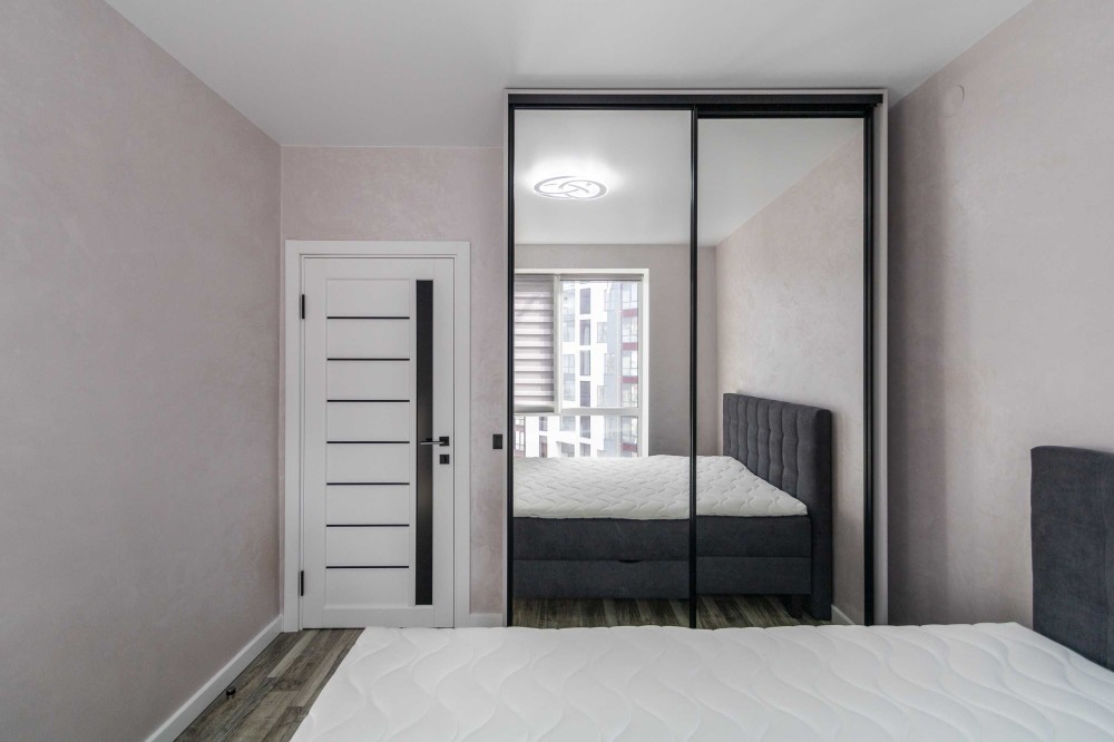 • На стіні розміщена велика шафа-купе з дзеркальними дверцятами, що візуально збільшує простір.