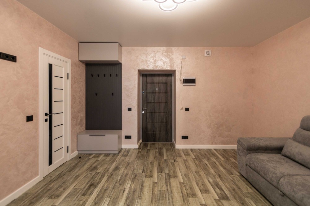 Квартира виконана в сучасному мінімалістичному стилі, з увагою до деталей та поєднанням функціональності з естетикою.