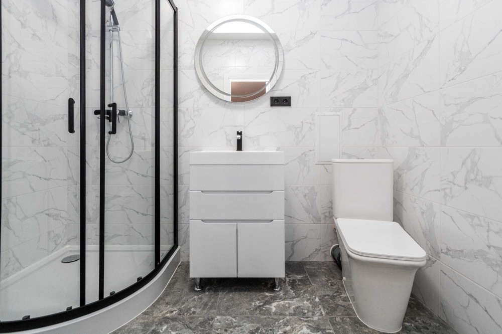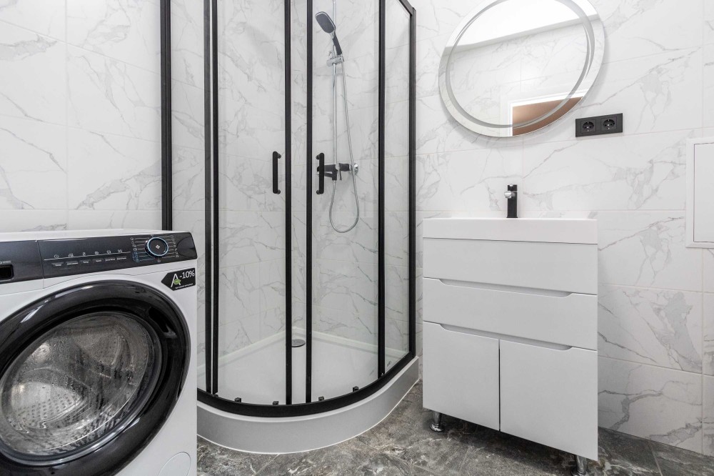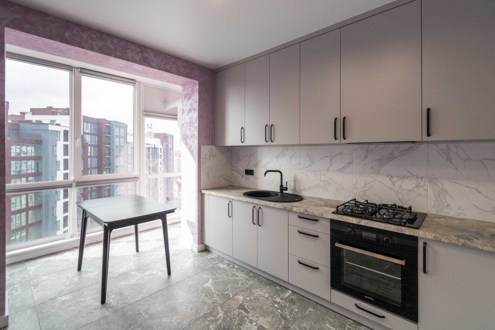• Мармурова стільниця та підлогове покриття з кам’яним ефектом підкреслюють сучасний стиль інтер’єру.