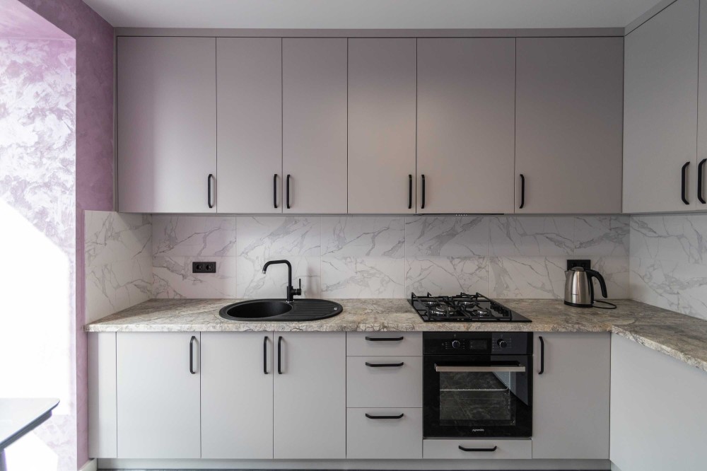 • Стильна кухня з сучасними меблями біло-сірого кольору.