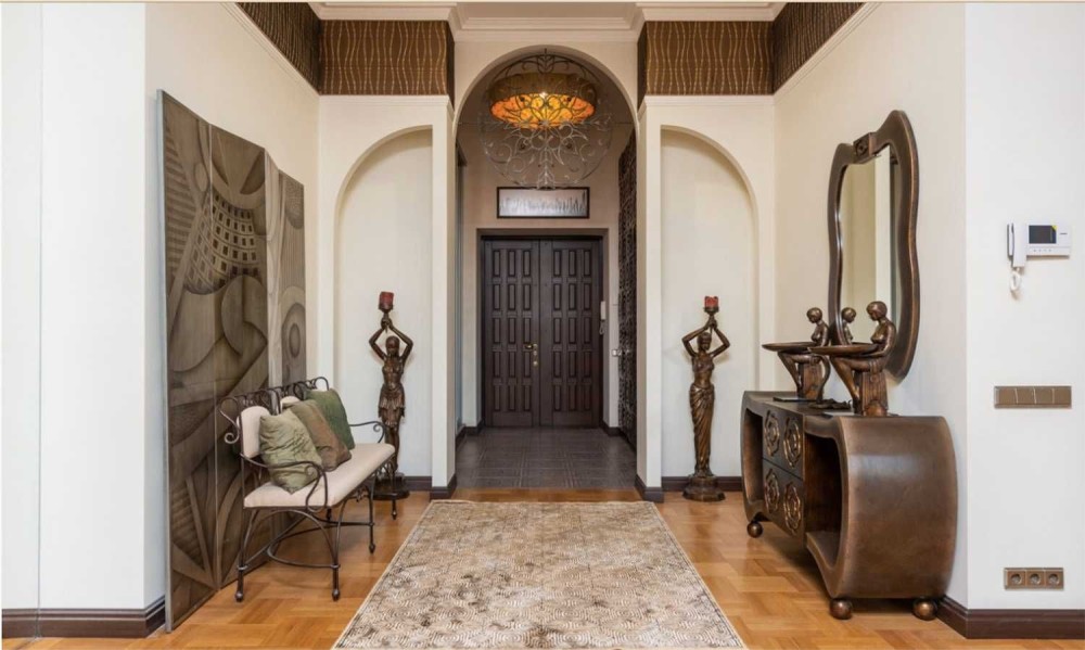 The apartment features a designer renovation in African style, with underfloor heating, parquet flooring, natural stone, imported furniture, full appliances, air conditioning, satellite TV, Wi-Fi, and a security system.