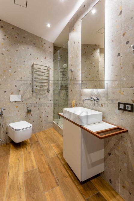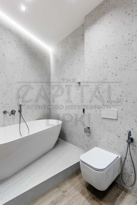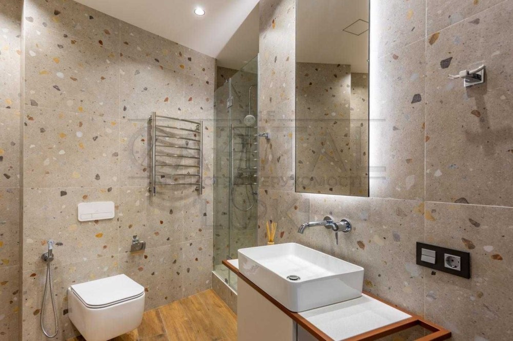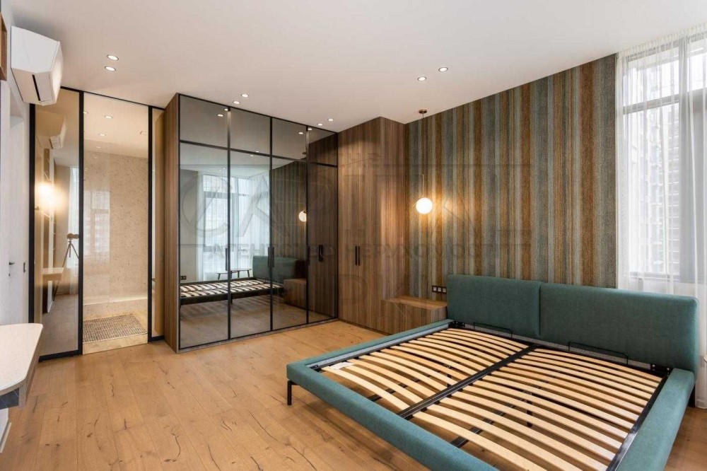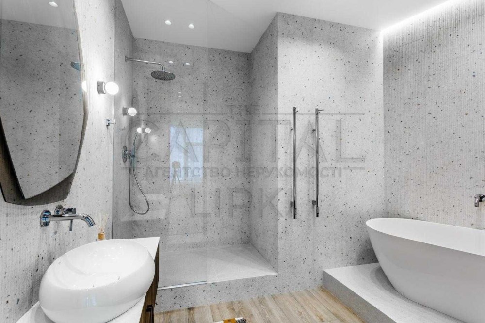 Планування квартири передбачає простору майстер-спальню із зоною гардероба та власною ванною кімнатою, обладнаною душовою кабіною та ванною.