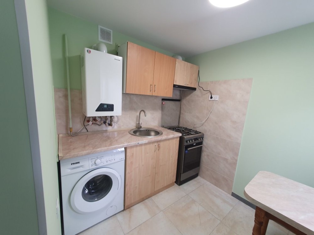 На кухні наявні необхідні меблі та техніка- холодильник, плита газова з електричною духовкою, пральна машина.