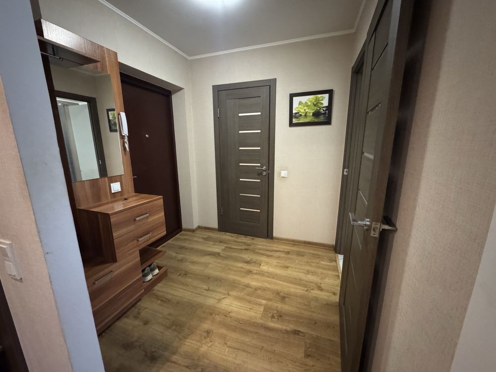 Квартира повністю укомплектована всіма необхідними меблями та технікою. У кімнаті - двоспальне ліжко та велика шафа-купе. У прихожій облаштована зручна стінка для верхнього одягу та зберігання речей.