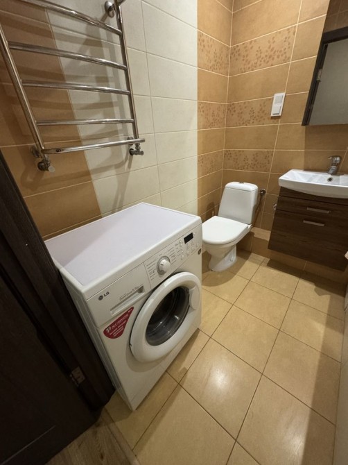 Суміжний санвузол обладнаний ванною, пральною машиною та рушникосушкою. На кухні - вбудовані меблі, обідня зона та вся необхідна техніка: газова варильна поверхня, холодильник, мікрохвильова піч, електрочайник.