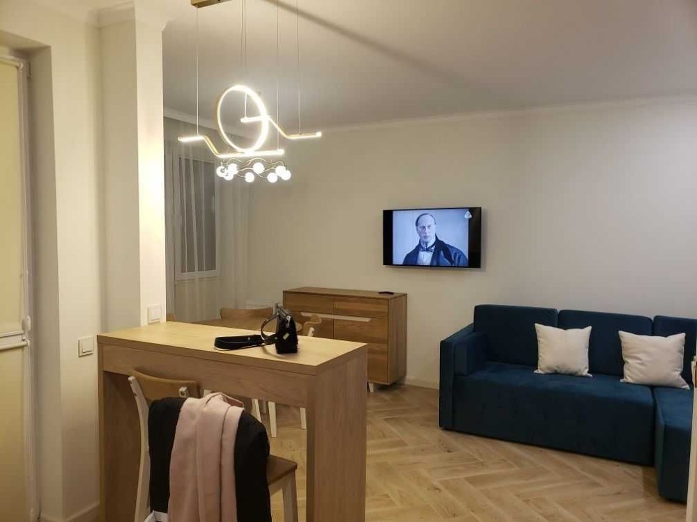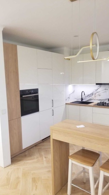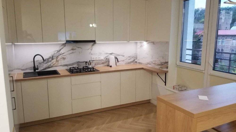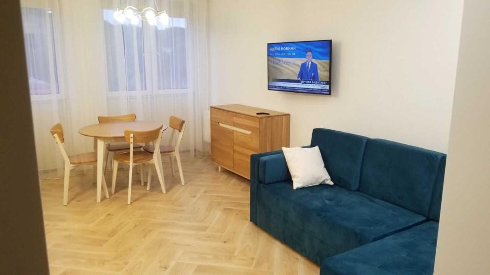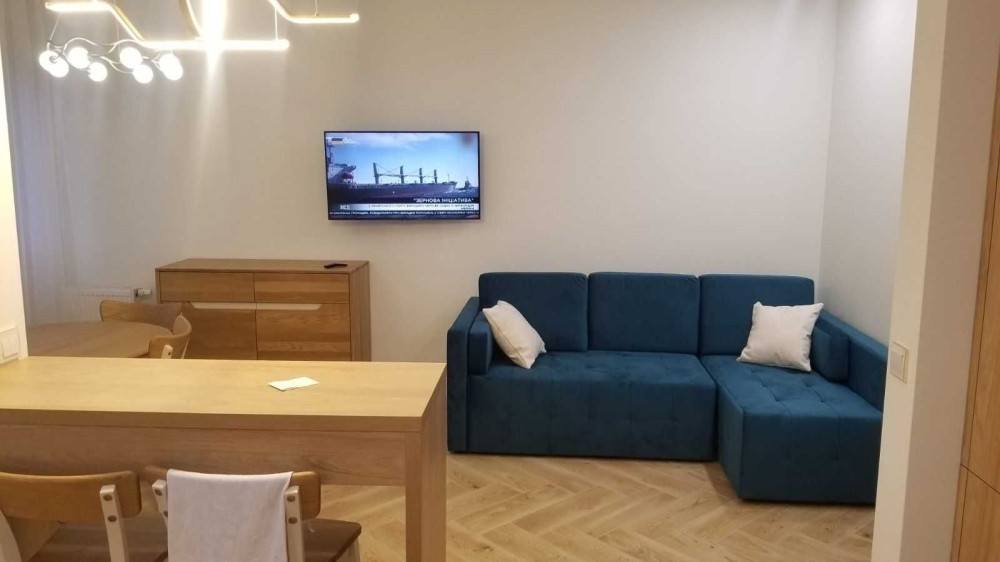 Кухня-студія з якісною фурнітурою Blum та продуманим наповненням. Квартира укомплектована всією необхідною побутовою технікою, а також кухонним приладдям і посудом на 4 особи.