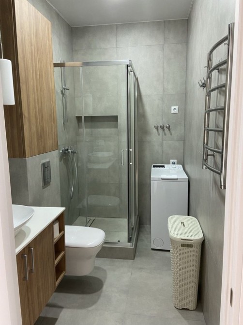 Санвузол суміжний із душовою кабіною, є пральна машина.