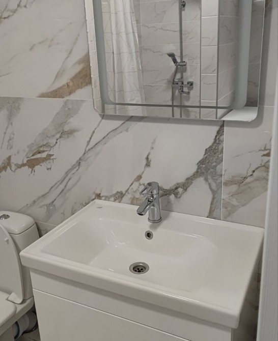 Санвузол виконаний у мармурових відтінках і має душ без сходинок — практично й естетично водночас. По всій квартирі встановлена система теплої підлоги, а індивідуальне опалення дозволяє самостійно контролювати комфорт.
