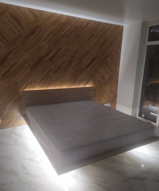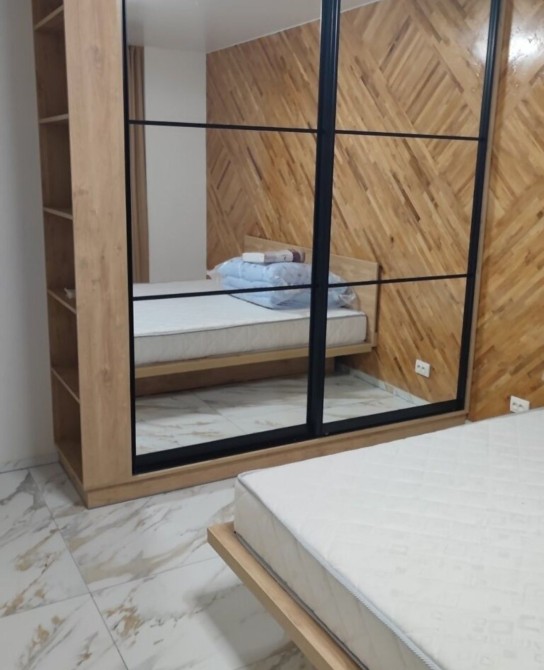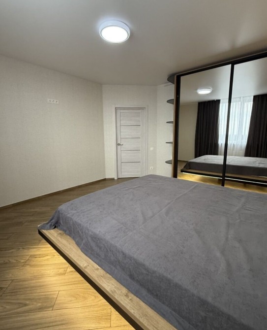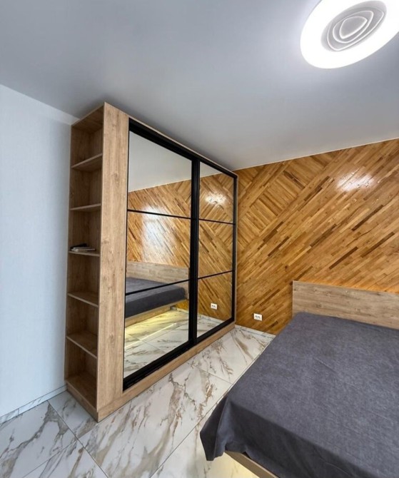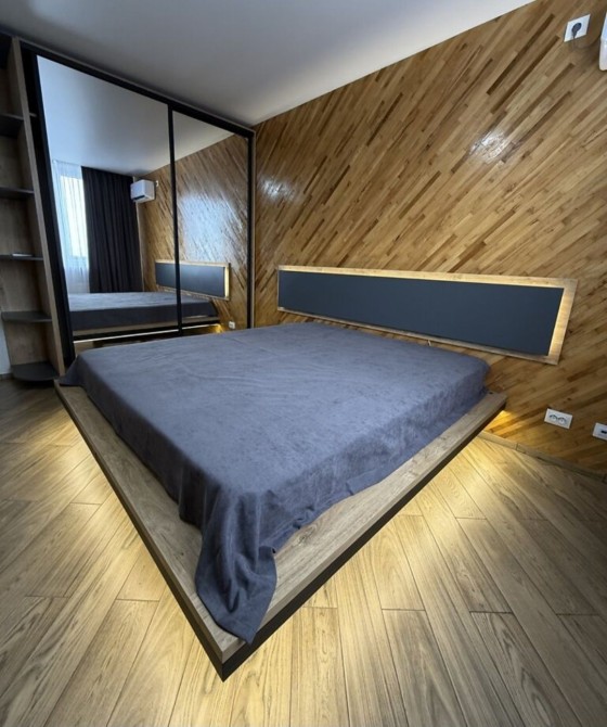 Інтер’єр квартири виконаний у сучасному стилі: дерев’яні фактури поєднані з дзеркалами й світлими поверхнями. У спальні — стильне двоспальне ліжко з підсвіткою, поруч — велика шафа-гардероб, яка візуально розширює простір. Вітальня-кухня облаштована диваном, обіднім столом і сучасною технікою: від мікрохвильової печі до холодильника та телевізора.