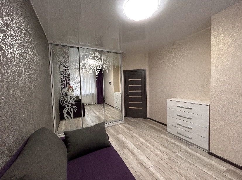 У кімнаті великий розкладний диван, велика шафа-купе, комод