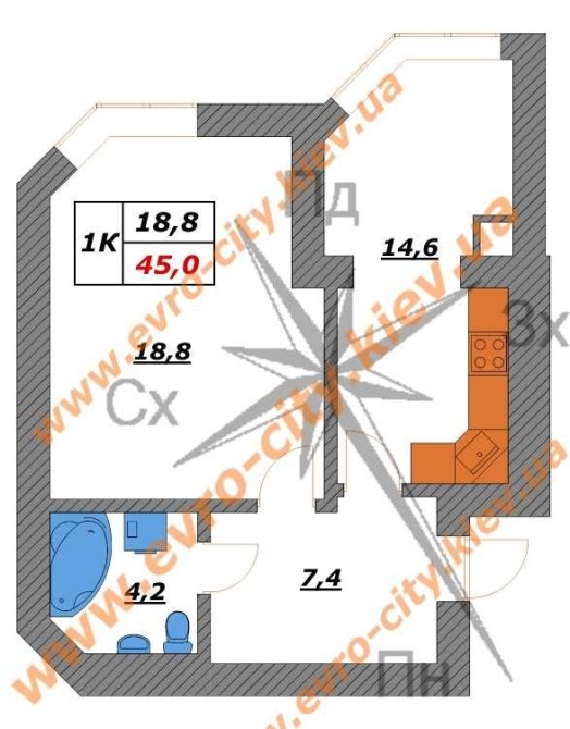 • Общая площадь 45 м2