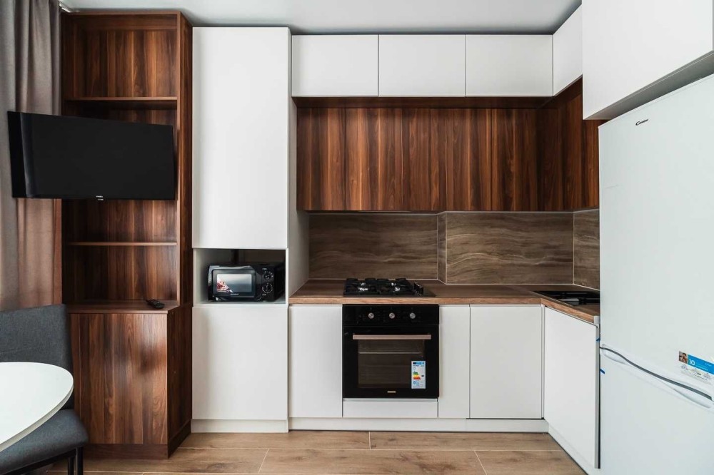 Кухня обладнана шафами для посуду та всією потрібною кухонною технікою, також має зручну обідню зону.