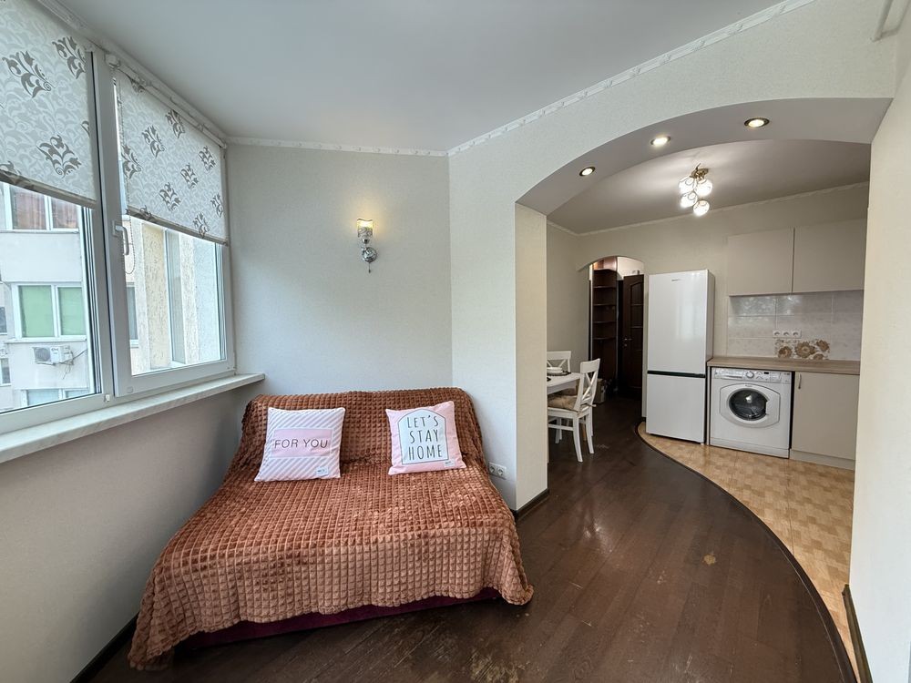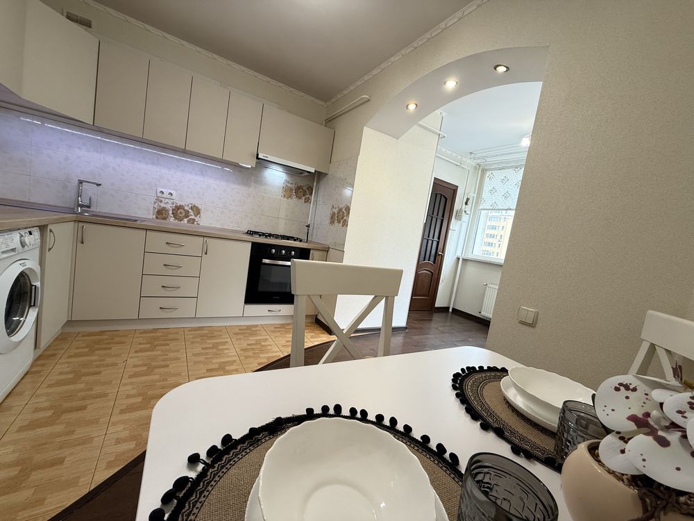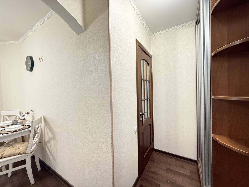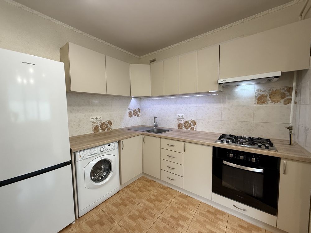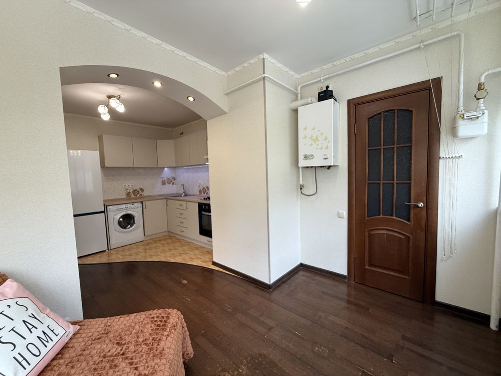 Після косметичного ремонту. Оновлені шпалери, текстиль, фасади, стільниця, фурнітура, стіл, витяжка, холодильник. Гарне планування. Велика кімната з ліжком та шафо. В коридорі шафа. Кухня з вбудованими меблями та технікою. На лоджії гостьовий диван. Є кладова. Індивідуальне опалення та лічильники, газовий котел.