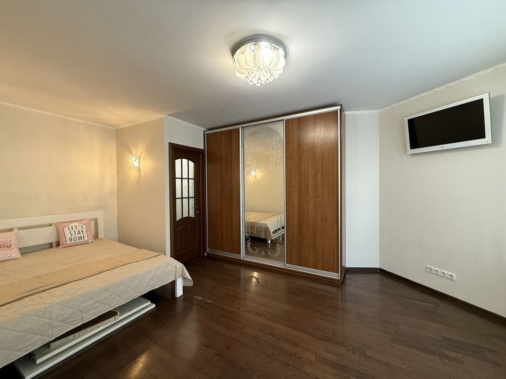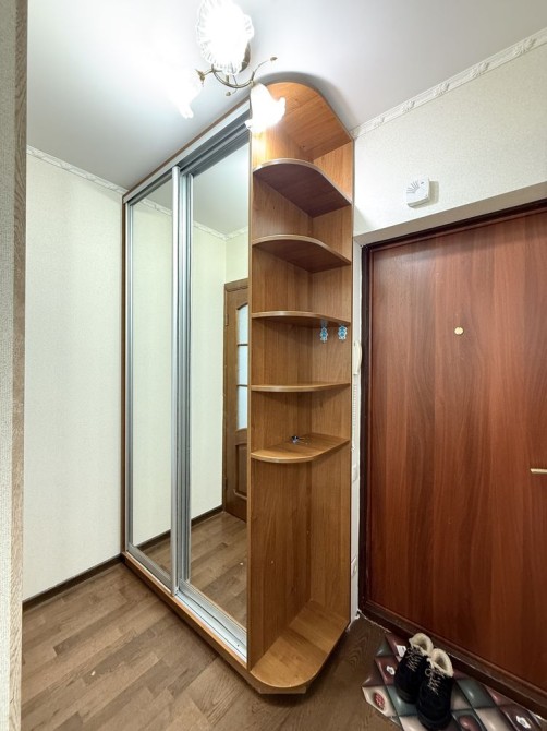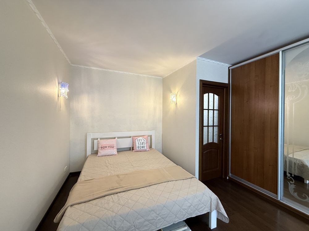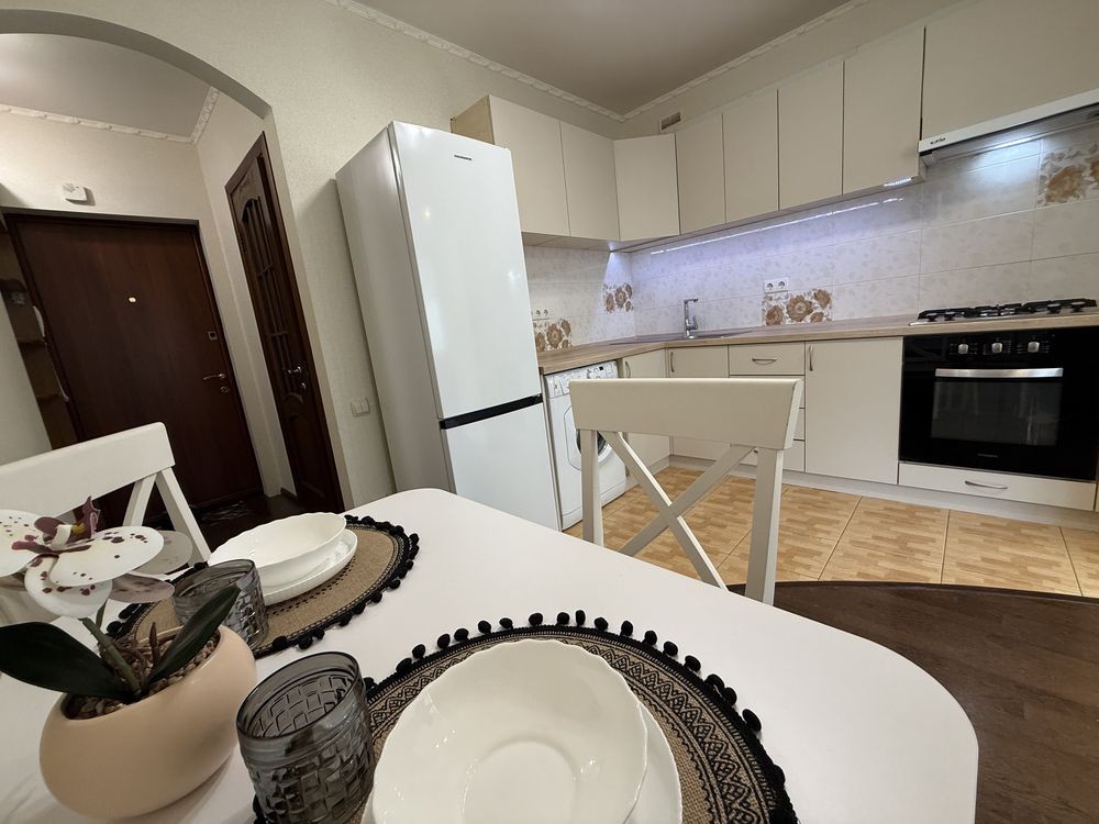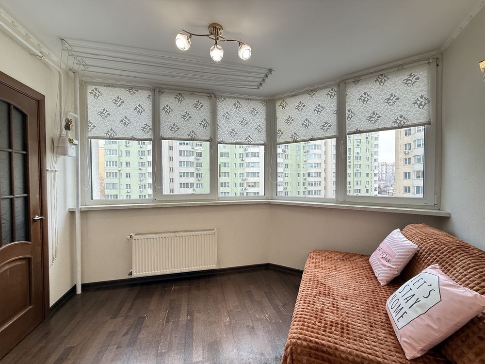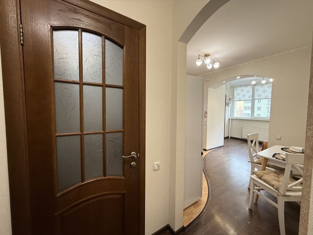 Після косметичного ремонту. Оновлені шпалери, текстиль, фасади, стільниця, фурнітура, стіл, витяжка, холодильник. Гарне планування. Велика кімната з ліжком та шафо. В коридорі шафа. Кухня з вбудованими меблями та технікою. На лоджії гостьовий диван. Є кладова. Індивідуальне опалення та лічильники, газовий котел.