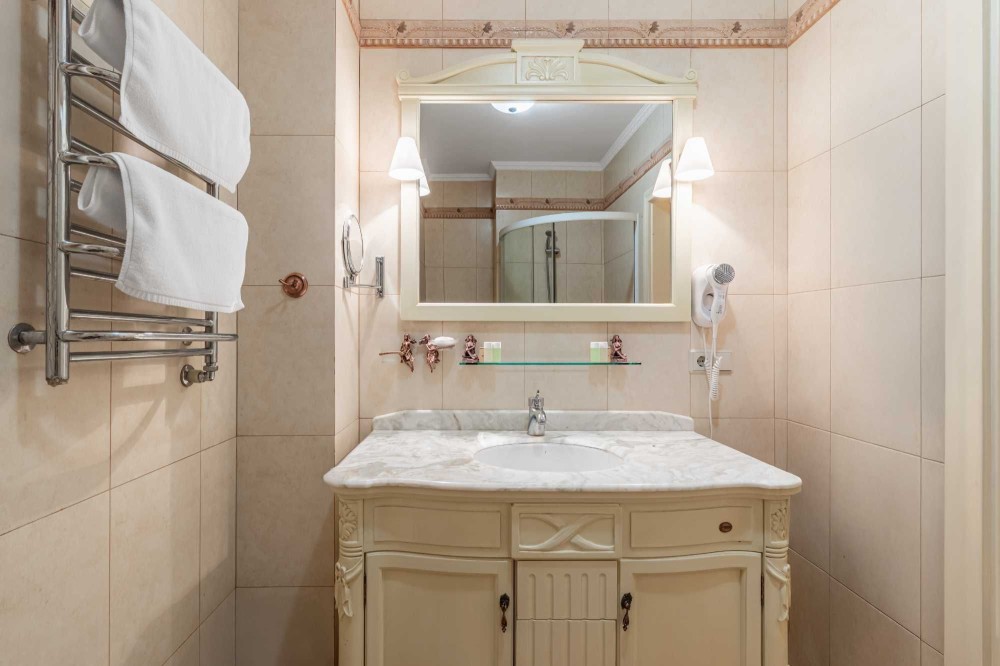 Санвузол компактно поєднаний з вбиральнею, всередині розташовані: душова кабіна, умивальник з дзеркалом, туалет і сушарка для білизни. Також завжди надається свіжа постільна білизна, чисті рушники, халати та засоби гігієни першої необхідності.