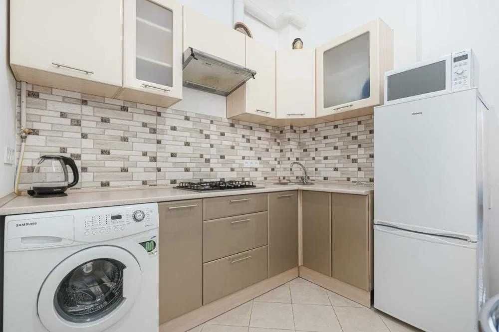 Квартира виконана у світлих тонах. Кухонна зона має необхідні меблі та техніку для комфортного перебування: холодильник, чайник, мікрохвильова піч, плита і посуд.