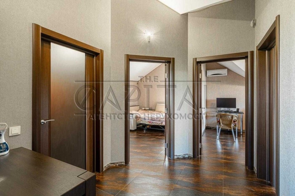 Село Забуччя. 13 км від КП по Житомирській трасі, 19 км від автост.Дачна. 4 км до ЖК Синергія (Ірпінь), 7 км до Бучі. Будинок має 6 кімнат (4 спальні), 2 зали, 4 санвузла, душова. Асфальтований під'Їзд.Будинок під охороною, камери відеоспостереження. Ділянка: Ландшафтний дизайн,басейн, автополив. Відкрита тераса з барбекю. Будинок має мансарду та цокольний поверх. На першому- хол та кухня-студіо, санвузол, туалет та гараж 35 кв.м.. На другому спальня та двоповерховий кабінет, який можно облаштувати під спальню. На третьому кабінет, спальня з санвузлом. Останній поверх- мансарда з санвузлом. На цокольному поверсі велика кімната( під спортзал)де є бігова доріжка, пральна, сауна,душова, техприміщення та 2 кімнати-кладові. На другому поверсі відкрита велика тераса, на третьому балкон. Підлога, керамограніт, плитка, ламінат. Газове опалення, підігрів підлоги на декількох поверхах. камін, сауна. 3 кондіціонера, газовий котел та електроболер. Інтернет оптоволокно.