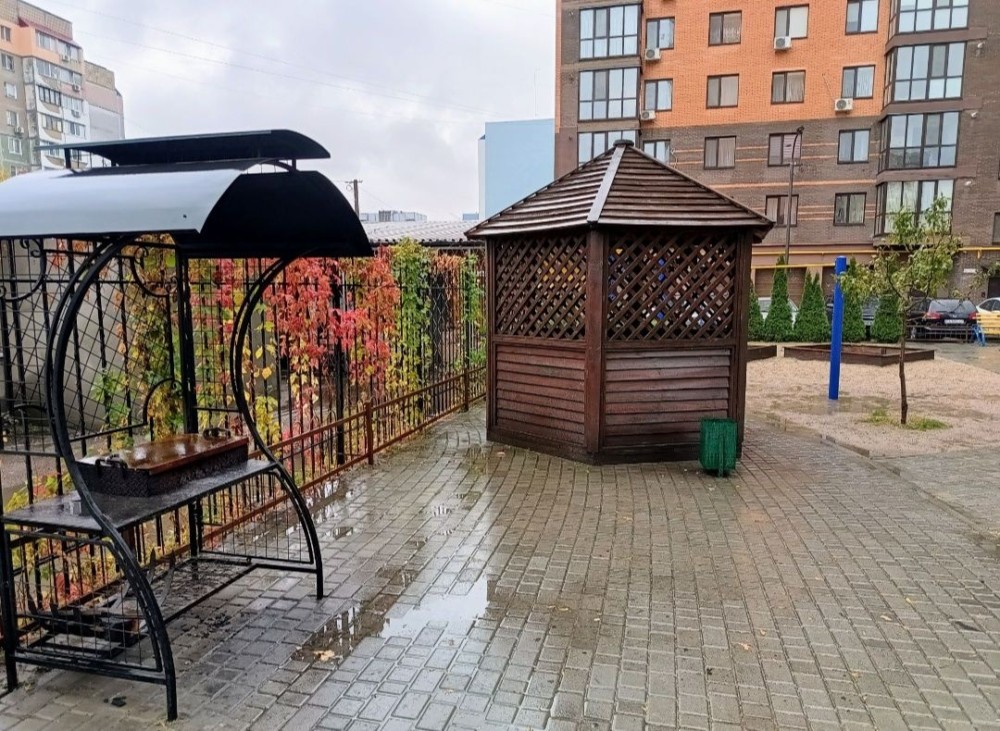 Двір закритого типу, автоматичні ворота, відеонагляд, парковка, затишна зона відпочинку, бесідки та місце для барбекю, дитячий майданчик.
