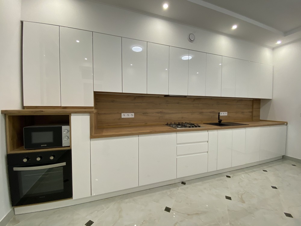 Кухня: Окрема зона для приготування та обідів, укомплектована вбудованою технікою (посудомийна машина, духова шафа, холодильник).