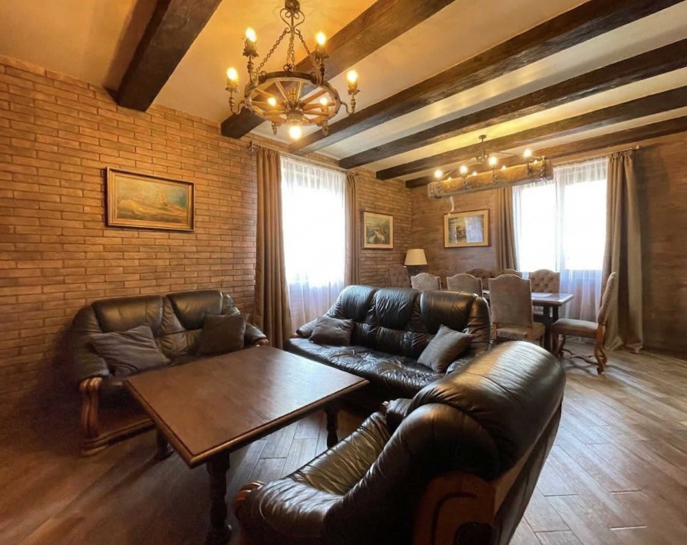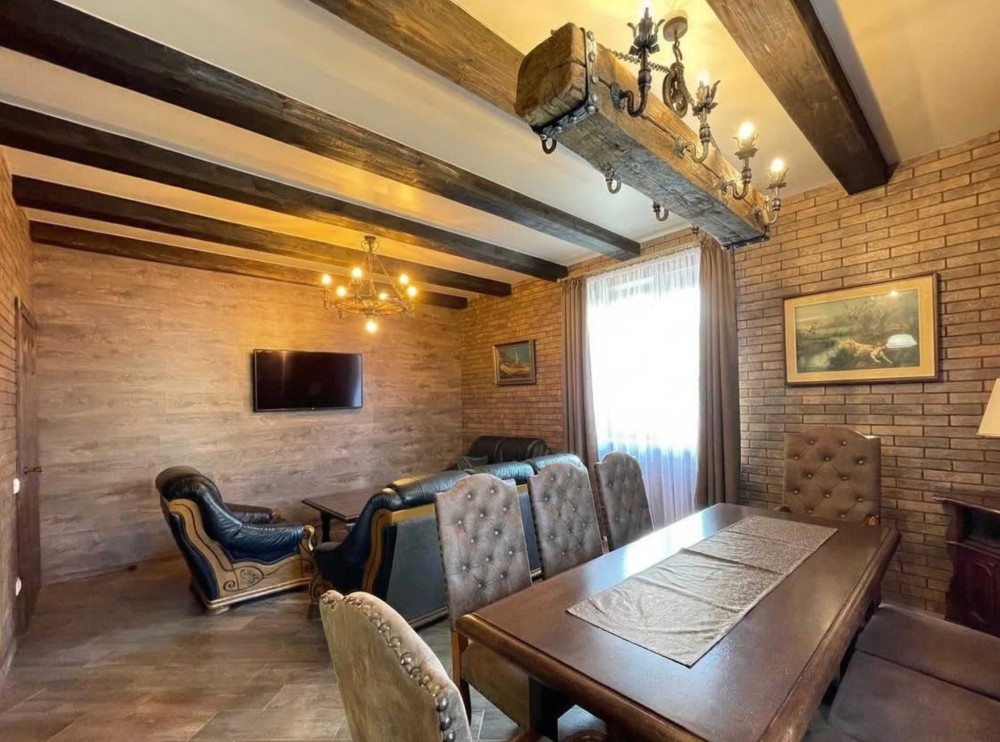 Простора вітальня, розділена на столову та відповчивальну зони.