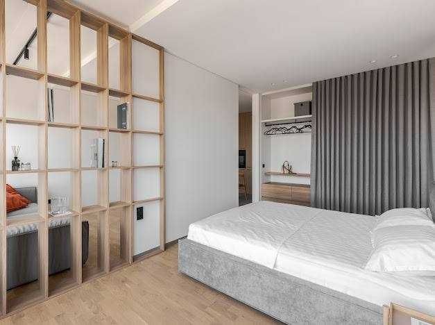 Зонування: передпокій з шафами для зберігання речей, кухня - вітальня, спальня з двоспальним ліжком, санвузол.