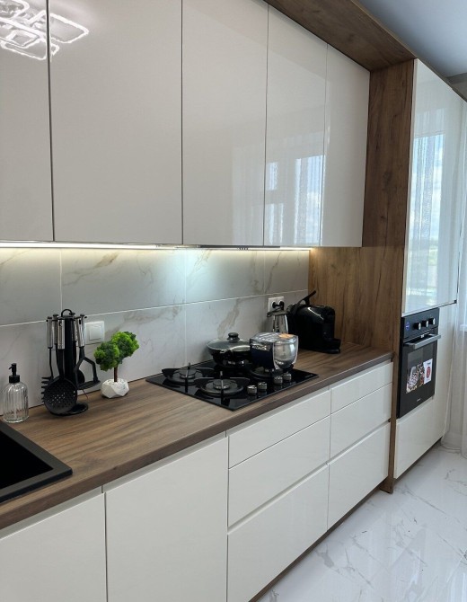 Кухня , де є вся необхідна техніка : холодильник , варильна поверхня , духовка , каво машина та кухонне приладдя , посуд .