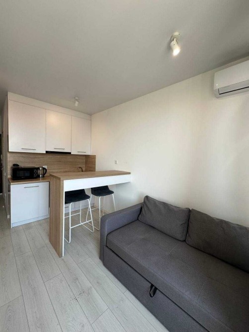 Завдяки оптимізованій площі 21,6 м2 економія щомісячних комунальних платежів. При цьому в квартирі є все необхідне: телевізор, інтернет, кондиціонер, холодильник, мікрохвильова піч, скляна варильна поверхня, духова шафа, пральна машина, шафа-купе, розкладний диван. У санвузлі є - бойлер, електрична сушка для рушників.