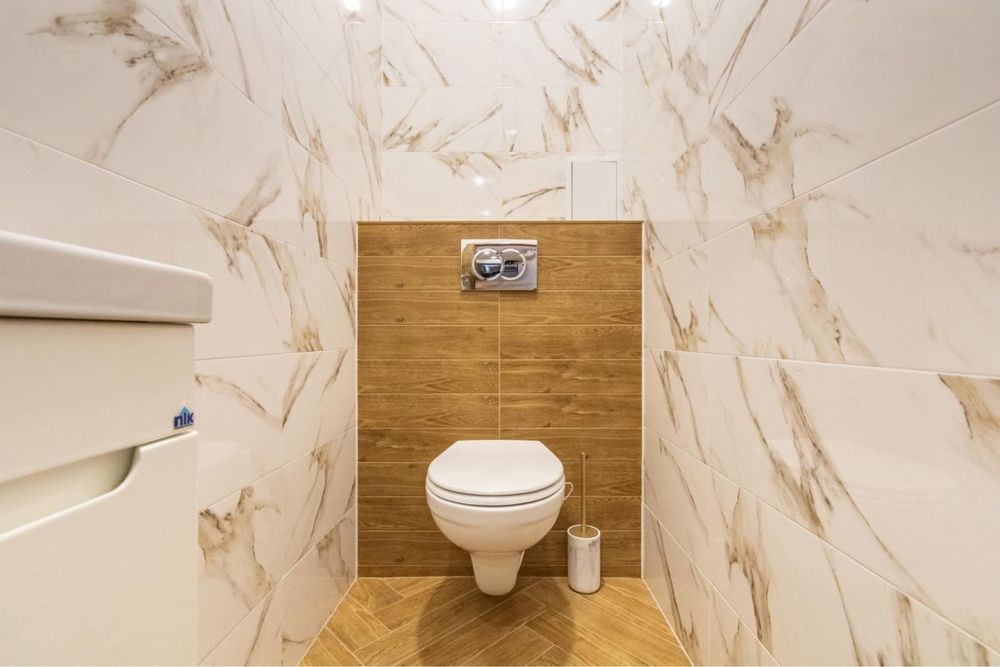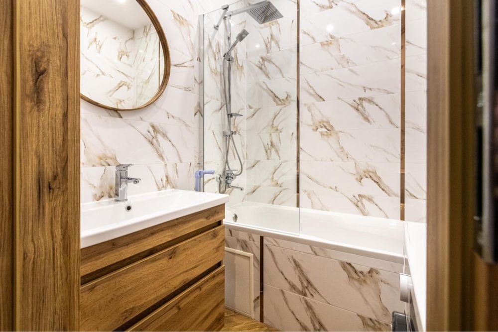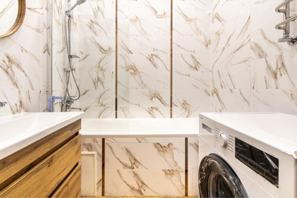 Санвузол сучасний, з ванною, виконаний у стильній плитці. Інтер’єр квартири виконаний у світлих теплих тонах, що створює атмосферу затишку та комфорту.