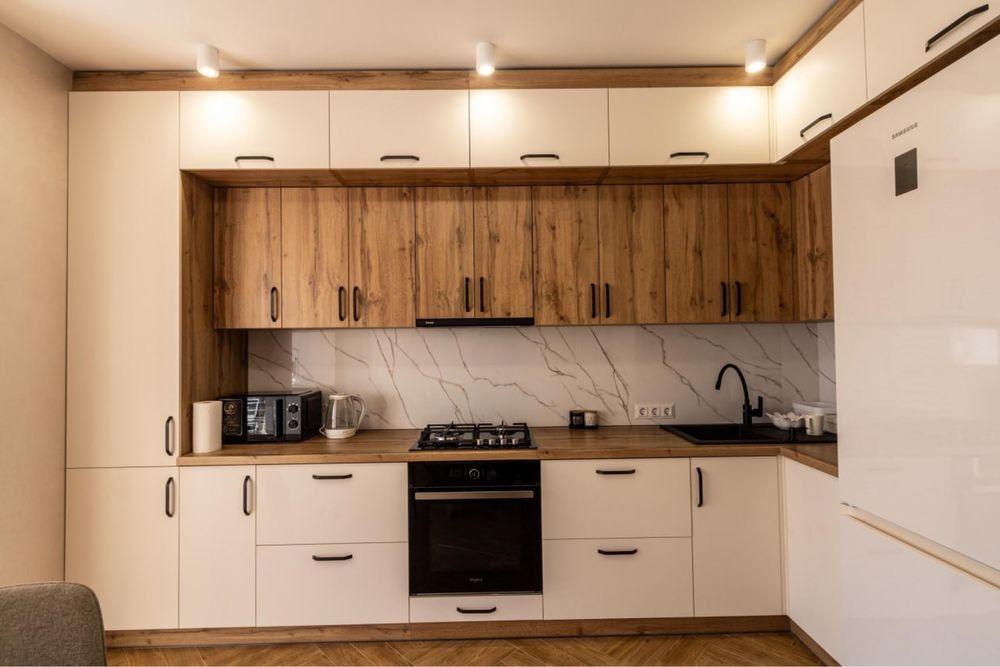 Планування дуже зручне: окрема спальня з великим двоспальним ліжком, світла вітальня з комфортним диваном та велика кухня-студія з обідньою зоною.