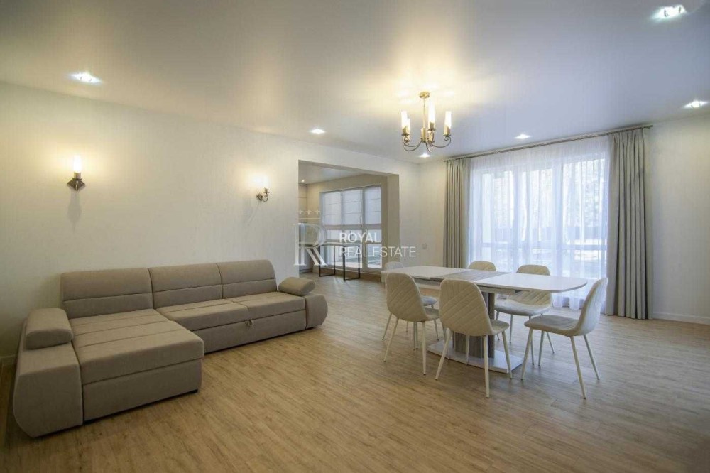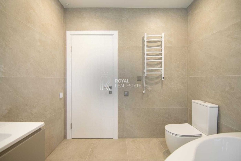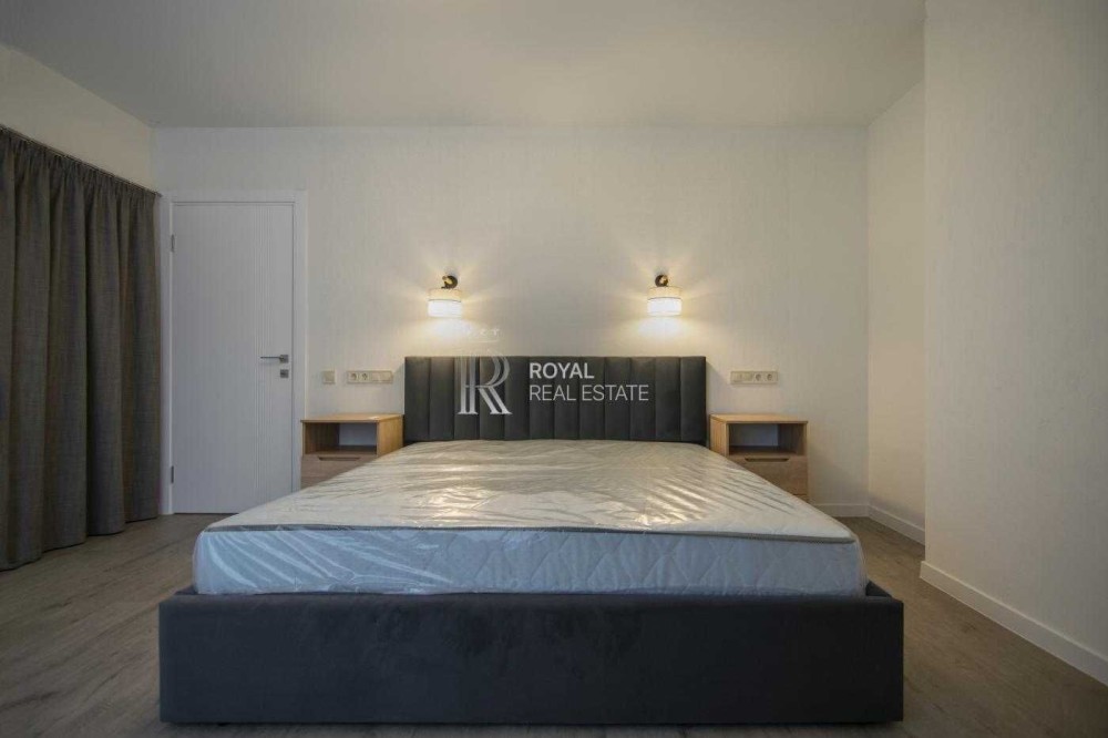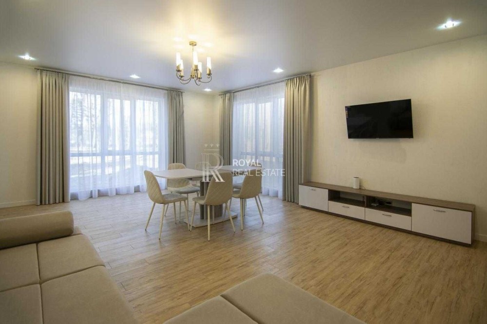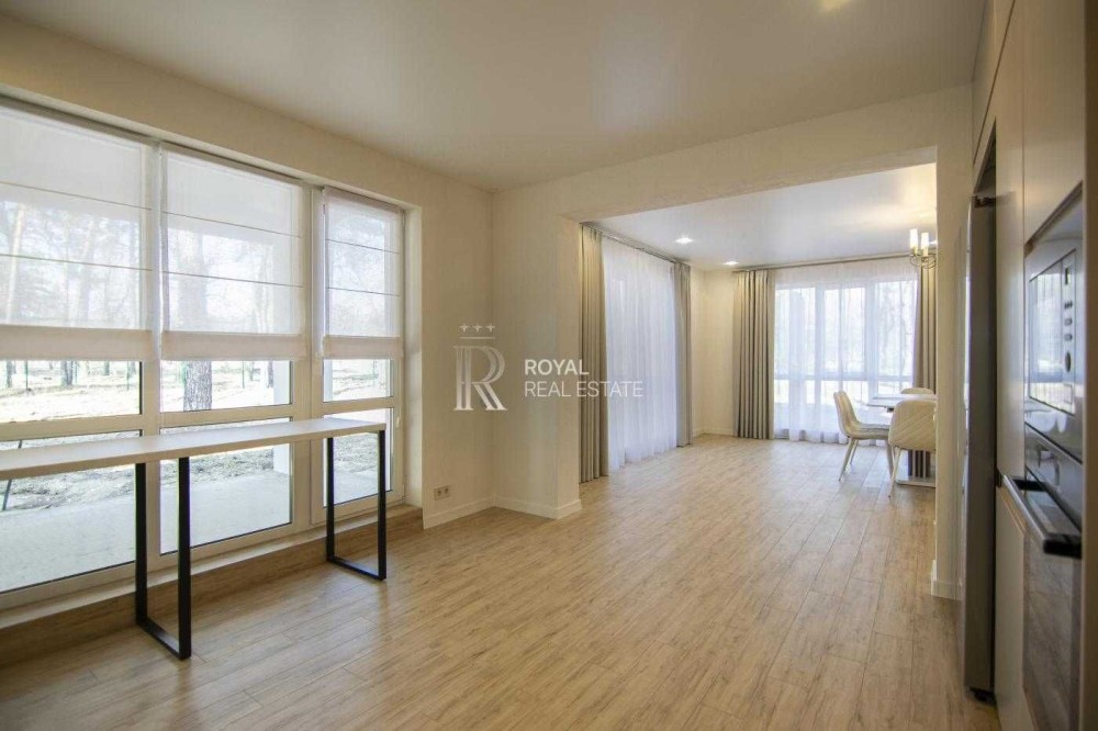 Планування продумане для сімейного життя: простора кухня-вітальня з виходом на терасу, три окремі спальні, два санвузли, гардеробна та технічне приміщення. Великі вікна додають світла та простору.