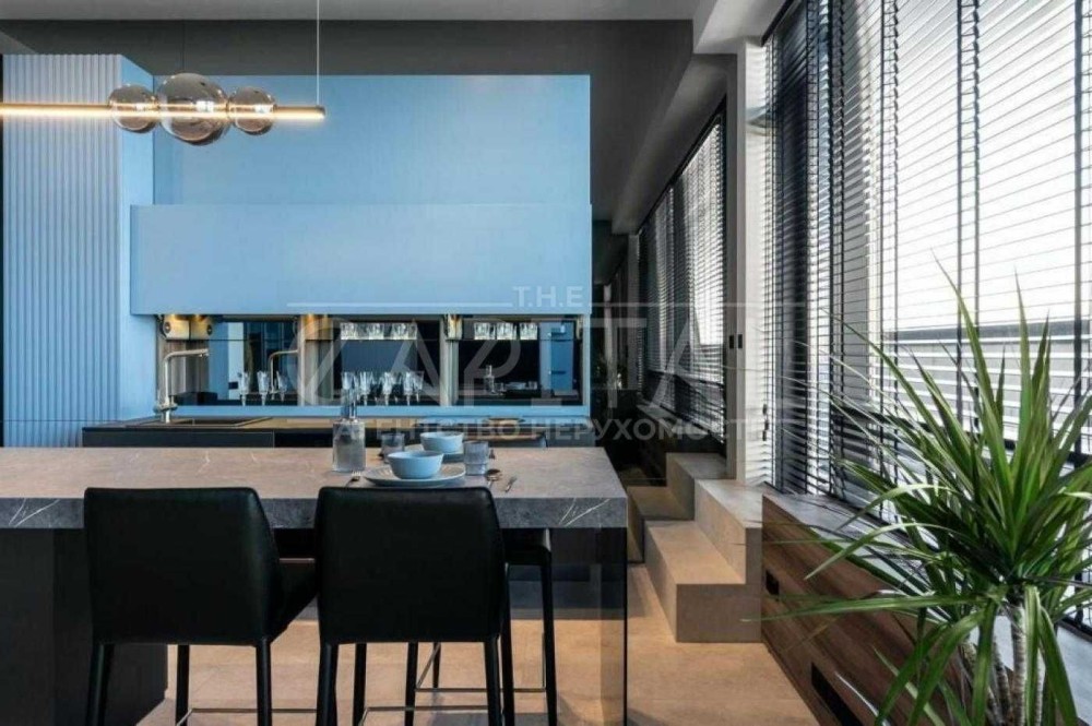 Дворівнева квартира з власною терасою та джакузі на ній. Якісний дизайнерський ремонт, високі стелі та панорамні вікна наповнюють простір світлом і створюють відчуття простору та комфорту.
