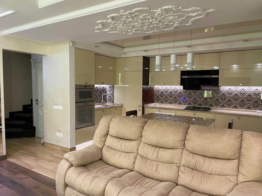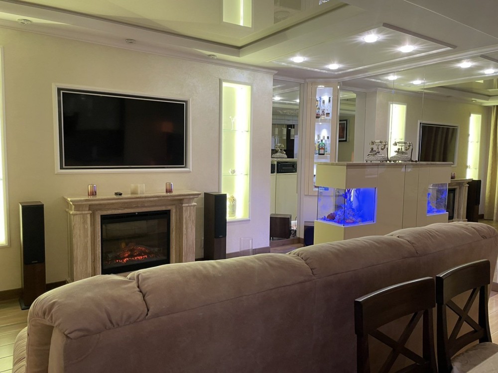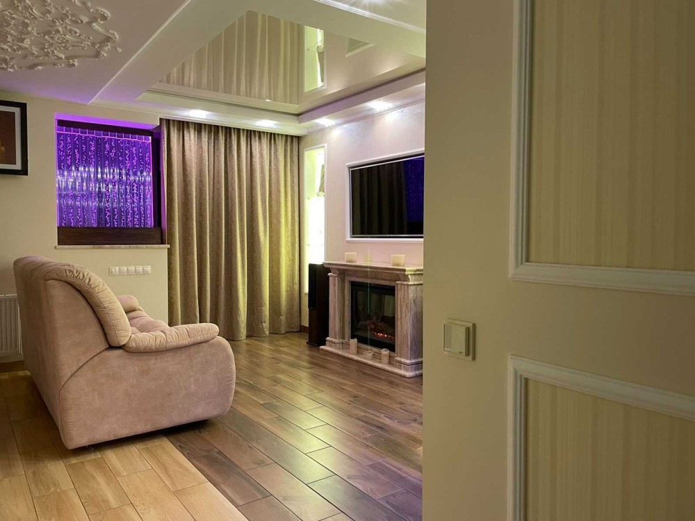 Комфортна велика кухня – studio (всі робочі поверхні кухні, барної стійки та камін виготовлені з італійського мармура): італійське обладнання (газова плита, багато функціональна духовка, мікрохвильова піч, витяжка, посудомийна машина, холодильник, холодильник для вина, пароварка, кавоварка, подрібнювач їжі, двоконтурний газовий котел, фільтр система 5-ти компонентної очистки води, кондиціонер); комфортний стильний диван; домашній кінотеатр; багаторівнева зручна підсвітка; великий французький панорамний балкон + 2 відкритих балкона з окремими виходами та прекрасним краєвидом на місто; сухий акваріум; водяна бульбашкова панель.
