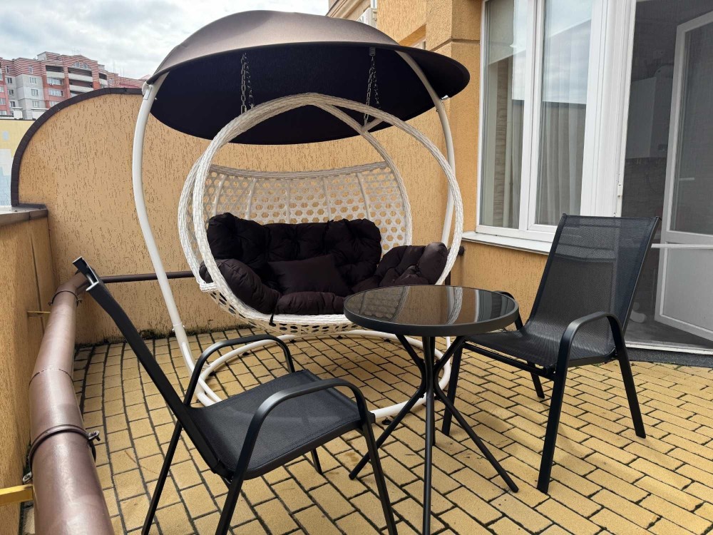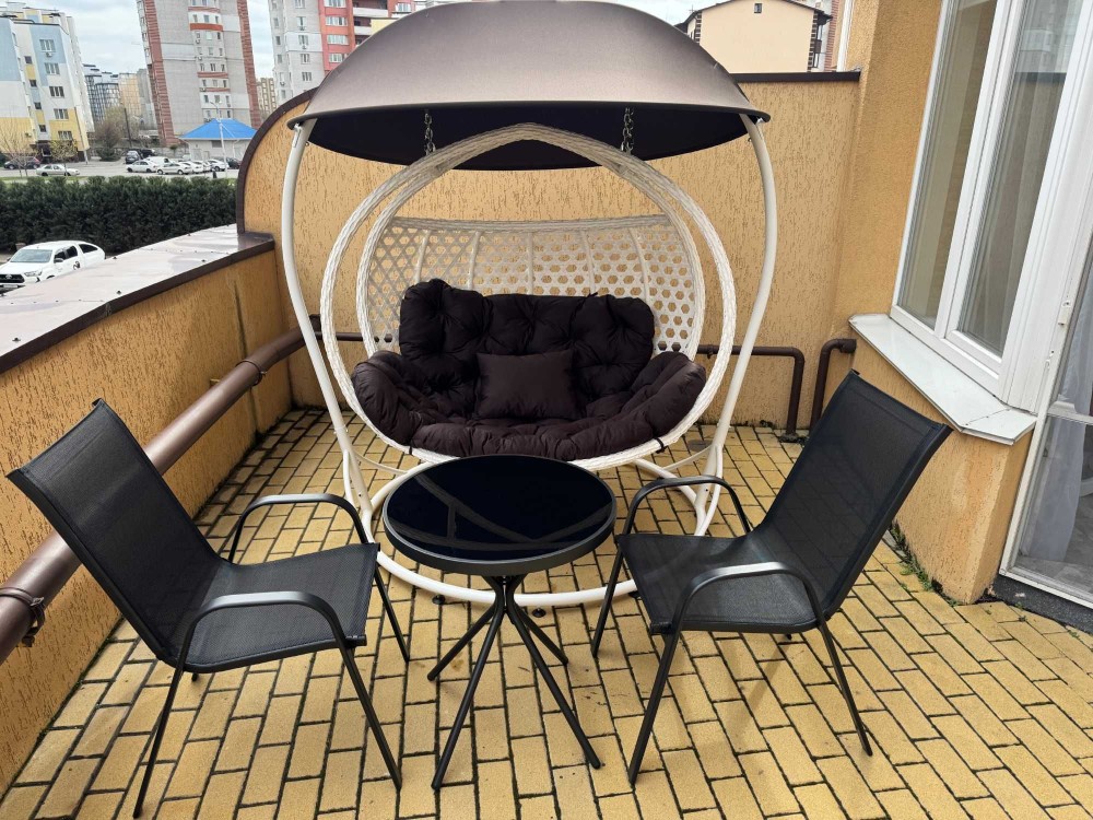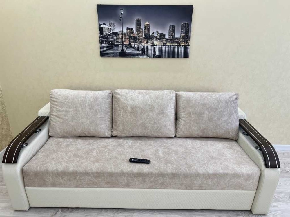 Розкладний двоспальний диван, двоспальне ліжко з ортопедичним матрацом, робоче місце, окрема кухня.