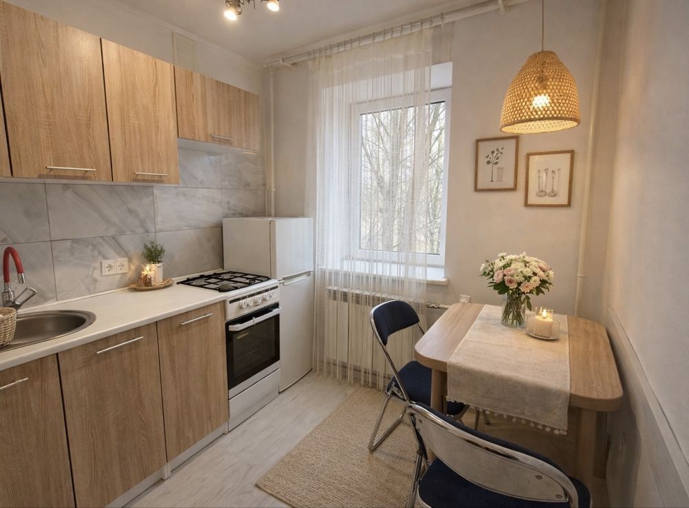 Повністю укомплектована кухня (плита, холодильник, обідня зона)