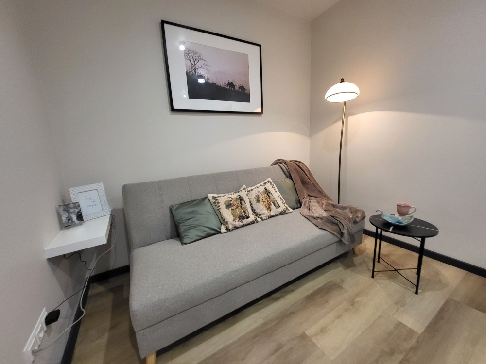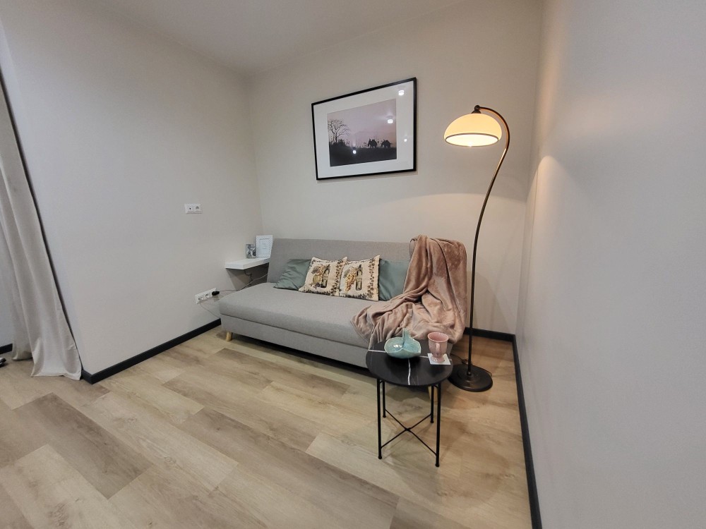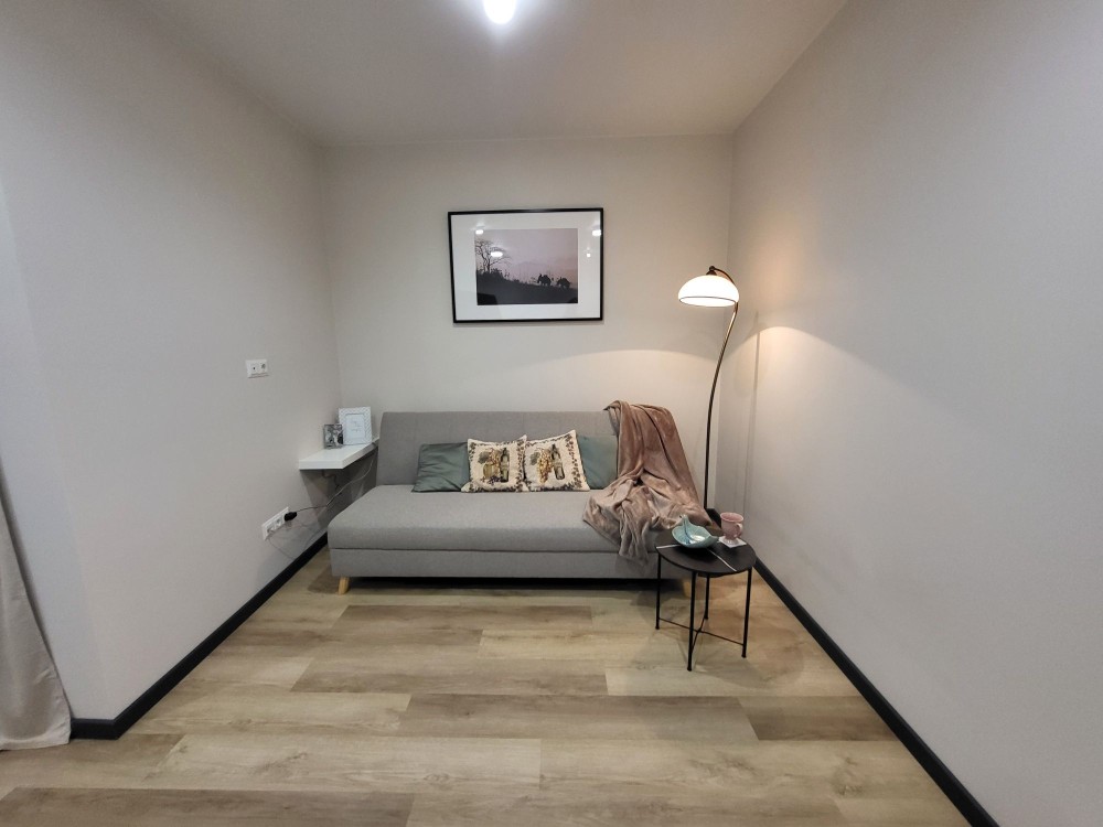 Простора вітальня-хол (16,5 м²): розкладний диван, окрема гардеробна