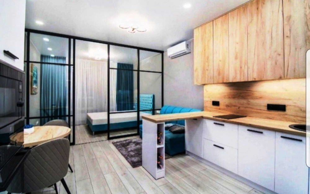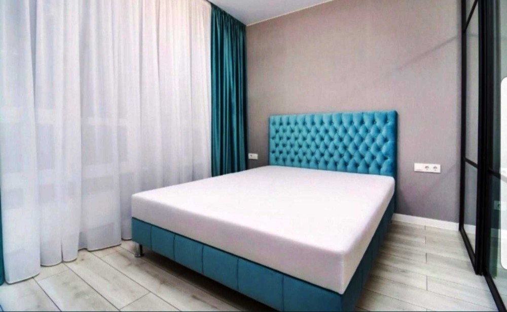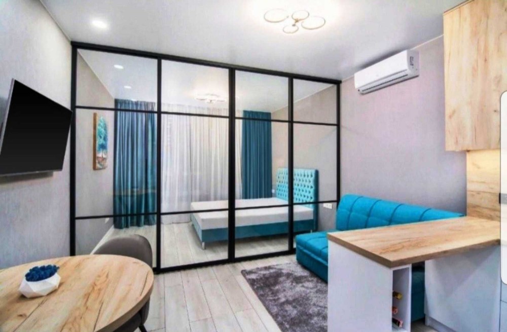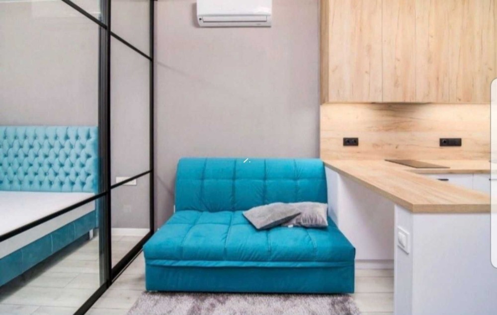 Здаємо в оренду компактну однокімнатну квартиру в ЖК Каховська 62 а Лівобережний масив Дніпровський район. Квартира на 15му поверсі із 24, площа 34 м кв. Спальна зона відділена перегородкою з ролетами. На фото без них. Ліжко з ортопедичним матрасом, диван розкладний , комфортний для сну, вбудовані шкафи.