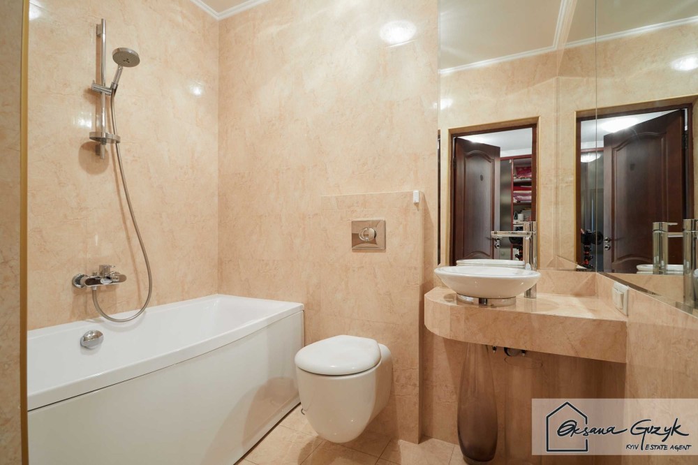 Санвузол вмістив ванну, умивальник з величезним дзеркалом для поціновувачів розкішних ранкових ритуалів.