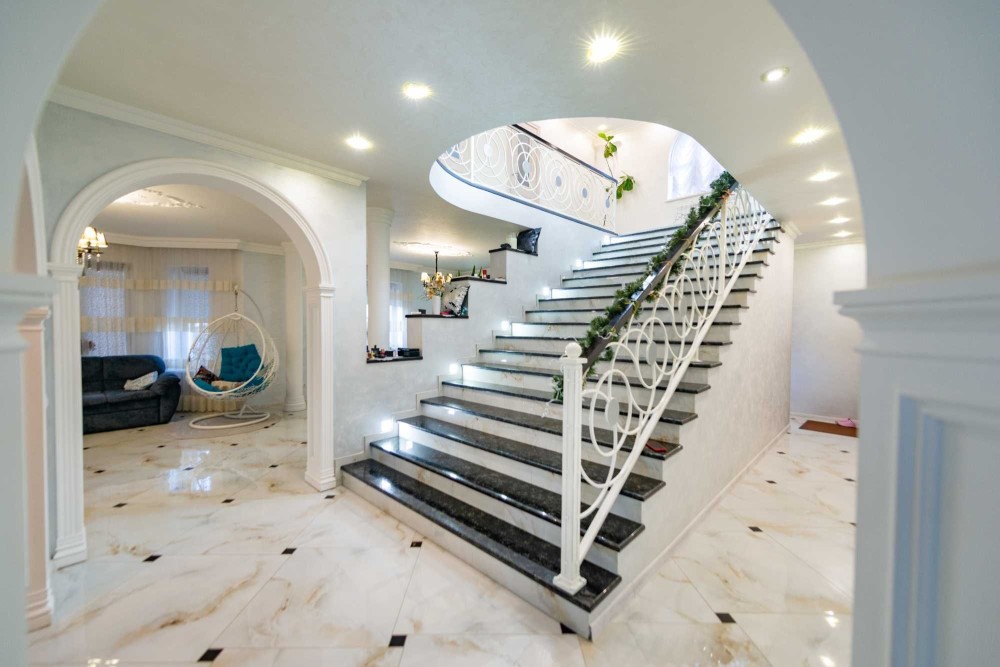 Дизайнерські сходи з підсвіткою від відомого майстра з використанням елементів чорно-білого кольору. Такий такий задум ппідкреслює впевненість у собі всіх, мешканців будинку...