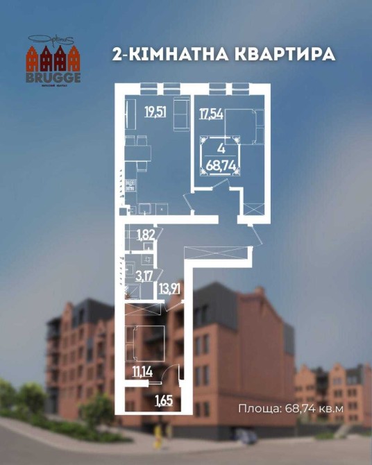 Остання 2-кімнатна квартира в ЖК Brugge з балконом 68,74м² без комісії