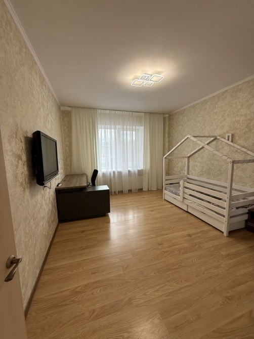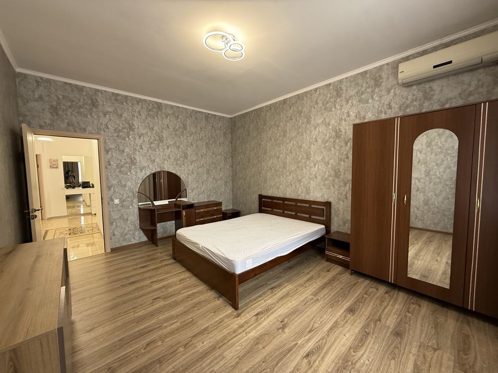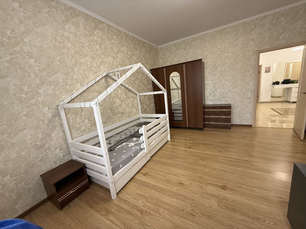 120 метров квадратных, выполнена в просторную кухню, зал, взрослую спальню и детскую (так же можно поставить обычную кровать - она имеется), 2 санузла с биде, гардеробная, шикарный балкон.