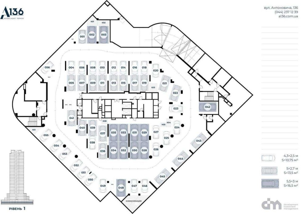 Продаємо паркомісце в підземному паркінгу житлового комплексу бізнес-класу А136 Highlight Tower. Перший рівень паркінгу. Паркомісця № 55 на схемі. Площа 10,75 м² . 80000$, без комісії.