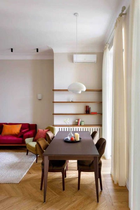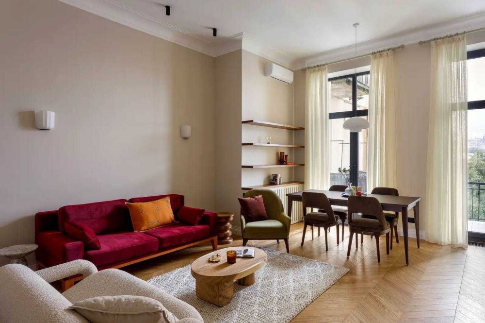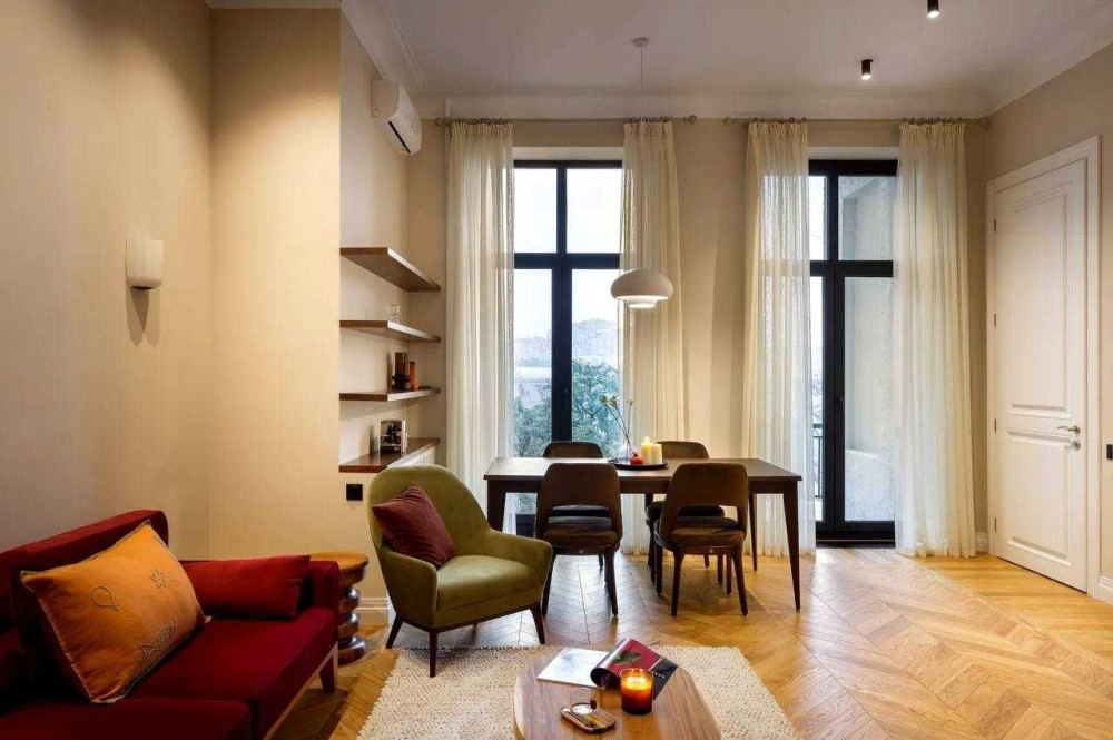 Квартира розташована в царському будинку , який є пам’яткою архітектури. Висота стель — 3,5 метри. Вікна виходять на дві сторони: спальні — у тихий двір, кухня та вітальня — на вулицю Марії Заньковецької.