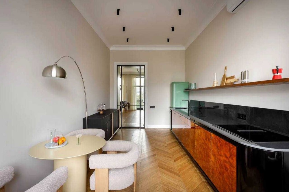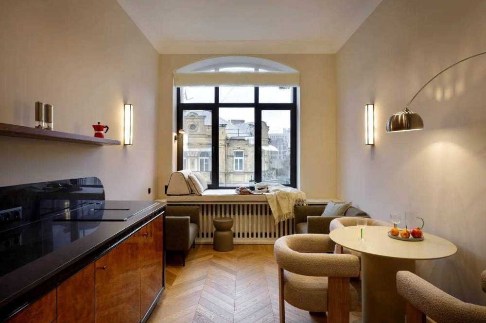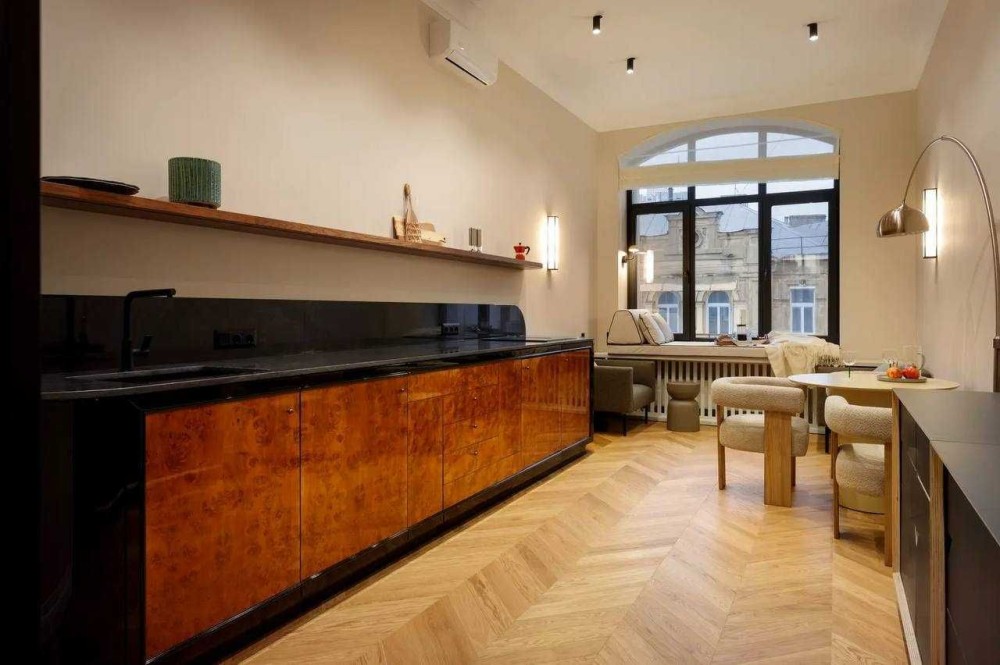 Кухня у стилі ар-деко — окремий витвір мистецтва, продумана до дрібниць, з затишним місцем для відпочинку що запрошує насолодитися чашкою кави або милуватися видом на місто.