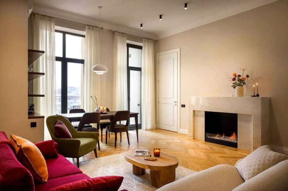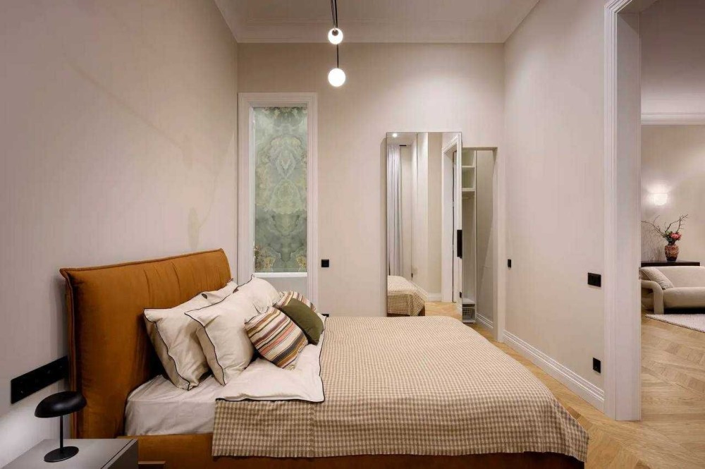 У квартирі: три кімнати, дві спальні, два санвузли та простора вітальня з мармуровим каміном. Підлога — художній паркет з натурального дерева, міжкімнатні двері з масиву.