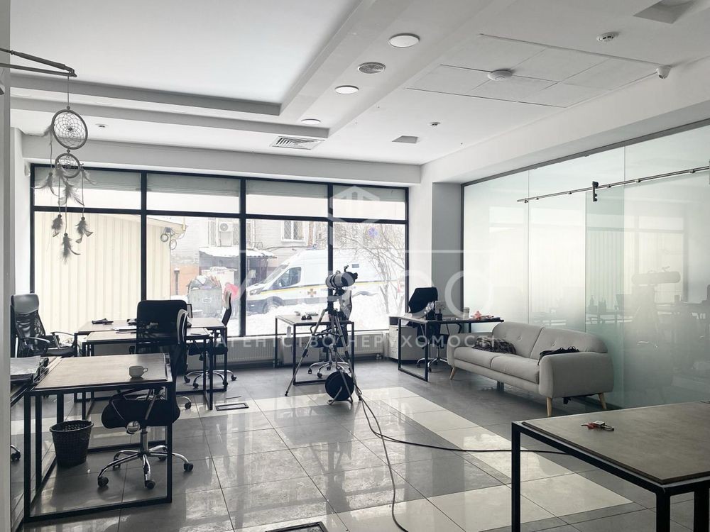 Оренда нежитлового приміщення з окремим входом, площа 198 м.кв. три зони open space, два сан.вузли, дві кладові кімнати, свіжий ремонт, панорамні вікна, підключений дизель генератор. Поруч метро "Арсенальна".