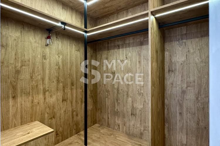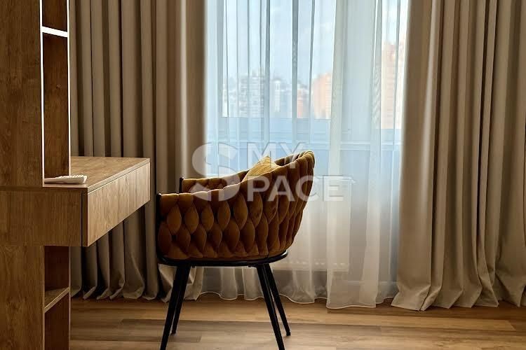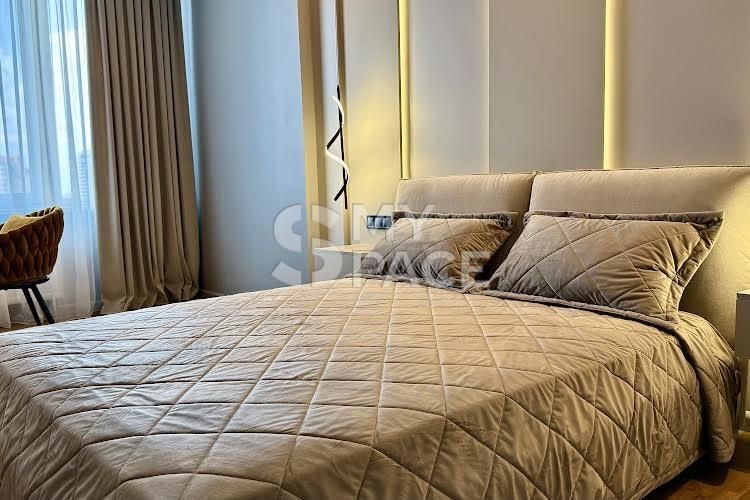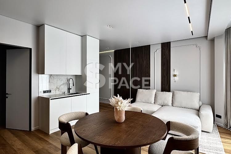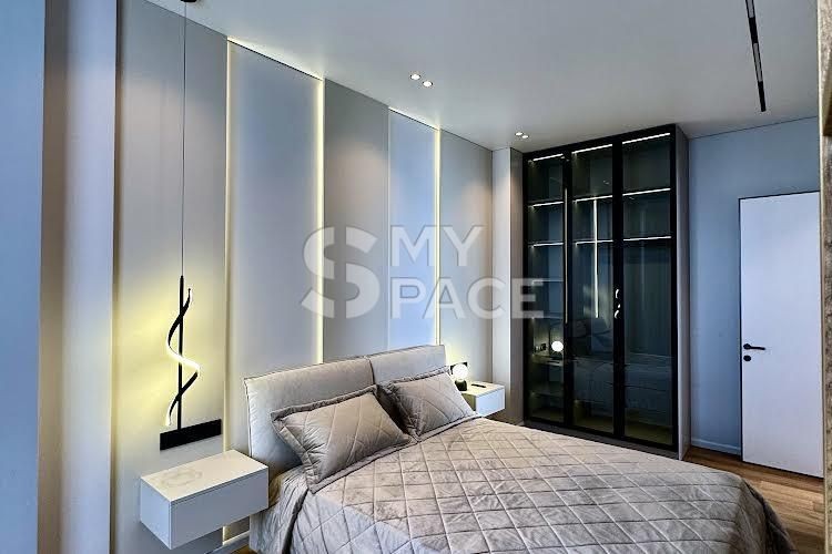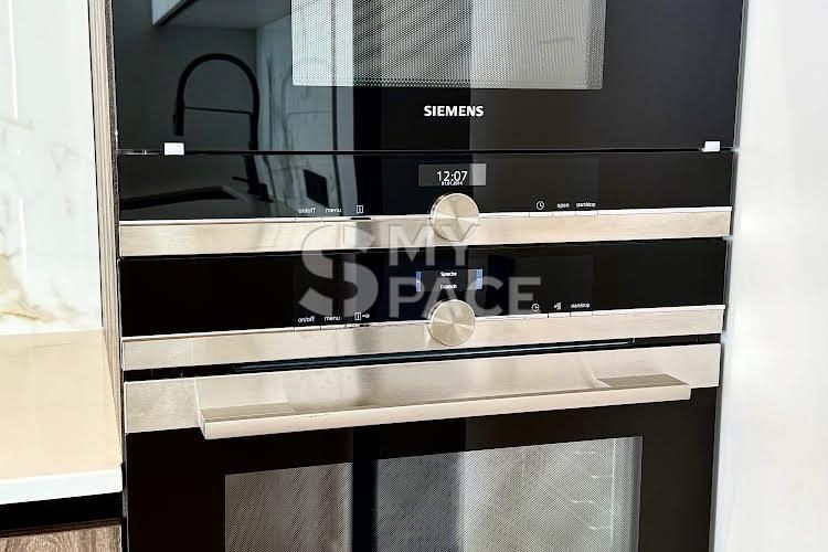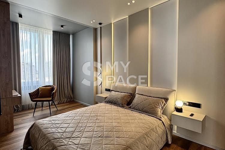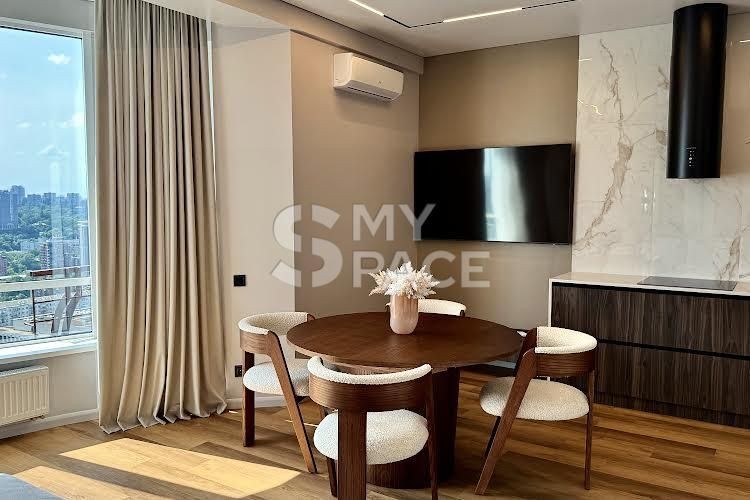 У помешканні щойно завершено сучасний ремонт, ніхто не проживав. Планування включає простору кухню-вітальню з видом на Палац України, майстер-спальню з власною гардеробною, санвузол з ванною та теплою підлогою. Встановлено повний комплект техніки Siemens, є пральна та сушильна машини. Головна перевага — великий балкон з панорамним видом на місто та парк.