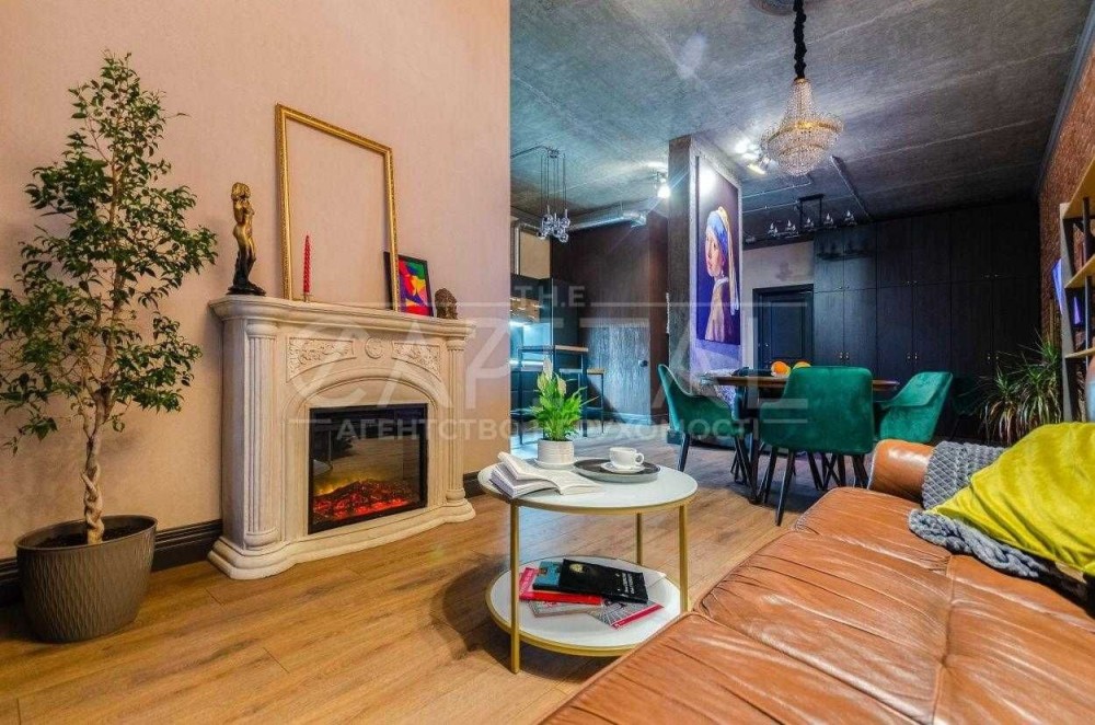 2. Зона для релаксу з каміном та диваном і також з величезним панорамним вікном з видом на місто