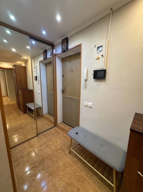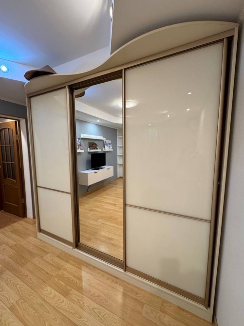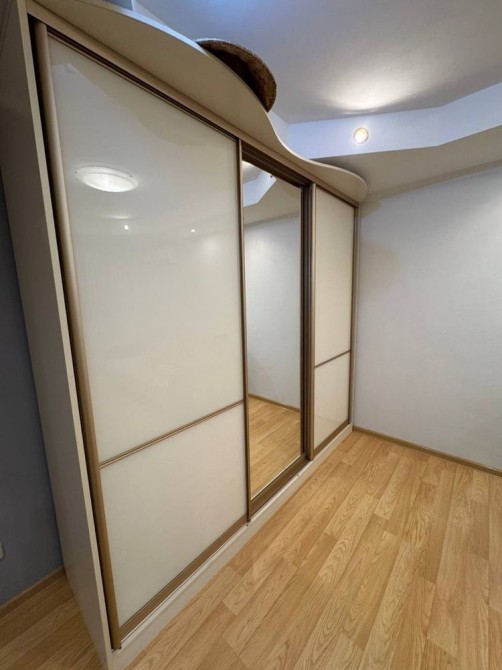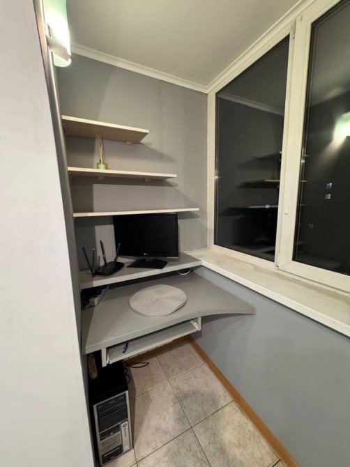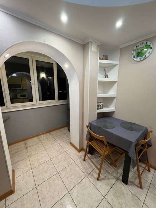 Велика вбудована кухня, холодильник, мікрохвильова піч, газова поверхня, духова шафа, кухонний стіл зі стільцями, встановлена система очистки води, бойлер, пральна машина, балкон – еркер на якому розміщене робоче місце (стіл) з телевізором. В коридорі дві шафи для верхнього одягу, комод, відеодомофон. Санвузол сумісний.
