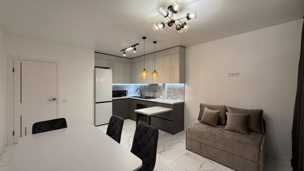 Квартира укомплектована якісними меблями та сучасною побутовою технікою, готова до проживання.